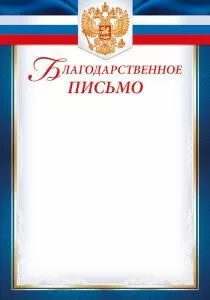 Шаблон благодарственного письма с изображением государственной символики и сдержанным оформлением. Подойдет для запечатывания на принтере.