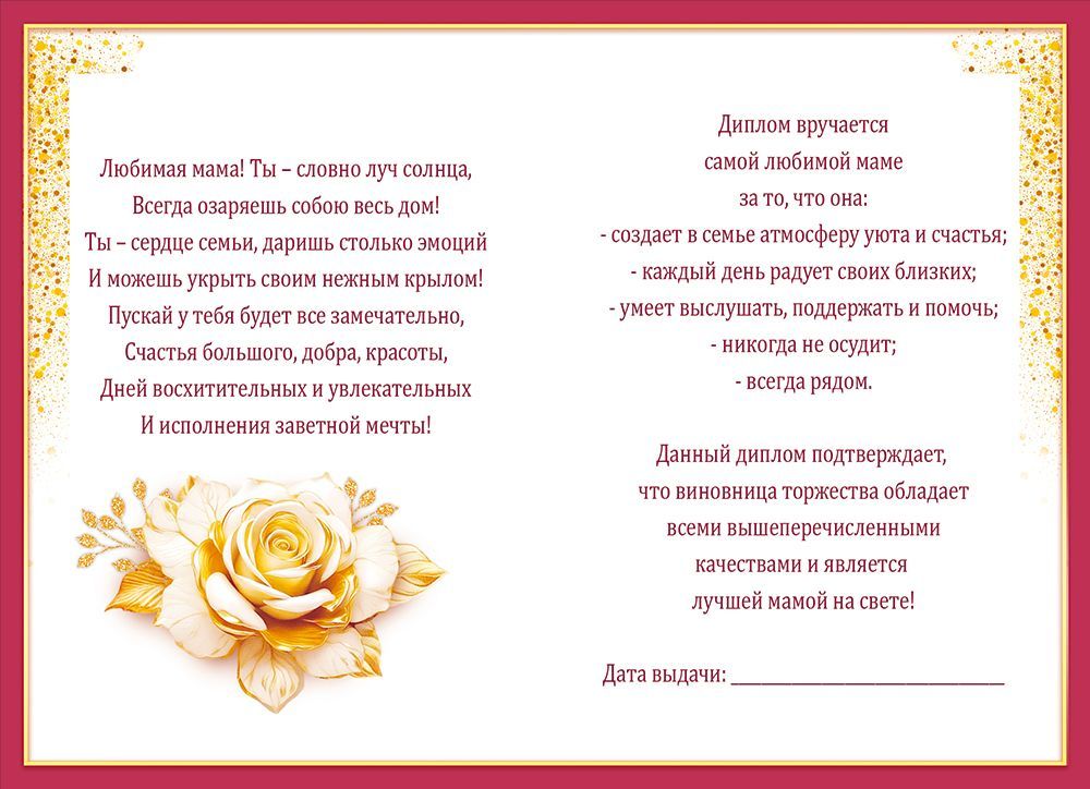 Диплом А6 «Лучшей мамы» выполнен из плотного картона и рассчитан на использование в качестве готового подарочного бланка для поздравления в семье, на корпоративных и тематических мероприятиях. Габариты готового изделия 160 × 110 мм обеспечивают совместимость с большинством стандартных конвертов и удобство экспонирования на стенде или в рамке. Лицевая сторона оформлена в насыщенной красно‑бордовой и золотистой гамме с крупной композиционной надписью «Диплом лучшей мамы» и детализированным цветочным орнаментом, что позволяет использовать изделие как самостоятельный сувенир без дополнительного декора. Для повышения износостойкости и сохранения яркости красок применена глянцевая ламинация, защищающая поверхность от истирания, влажных следов и выгорания при длительном хранении. Золотая фольга используется в оформлении надписей и декоративных элементов, создавая четкий оптический акцент и устойчивый к смятию рельеф, удобный для выкладки на витрине и формирования однородной полки в ассортименте поздравительной продукции. Внутри предусмотрен печатный текст с готовой поздравительной формулировкой и полями‑подсказками для внесения имени, даты, подписи и при необходимости дополнительных персональных пожеланий; это снижает временные затраты на подготовку вручения и исключает необходимость самостоятельного верстального оформления. Конструкция диплома рассчитана на стандартные условия транспортировки и складского хранения, не требует специальных температурных режимов, удобна для упаковки стопами. В одной упаковке 10, что позволяет оптимизировать оптовую закупку, планировать тираж под сезонный спрос к семейным праздникам, 8 Марта и профессиональным мероприятиям, где в сценарий включено награждение мам. Для розничного покупателя изделие представляет готовое решение: диплом можно вручить как отдельный сувенир либо дополнить им основной подарок, при этом жесткий картон и ламинированная поверхность обеспечивают аккуратный внешний вид при многократном перелистывании и длительном хранении в домашних архивах.