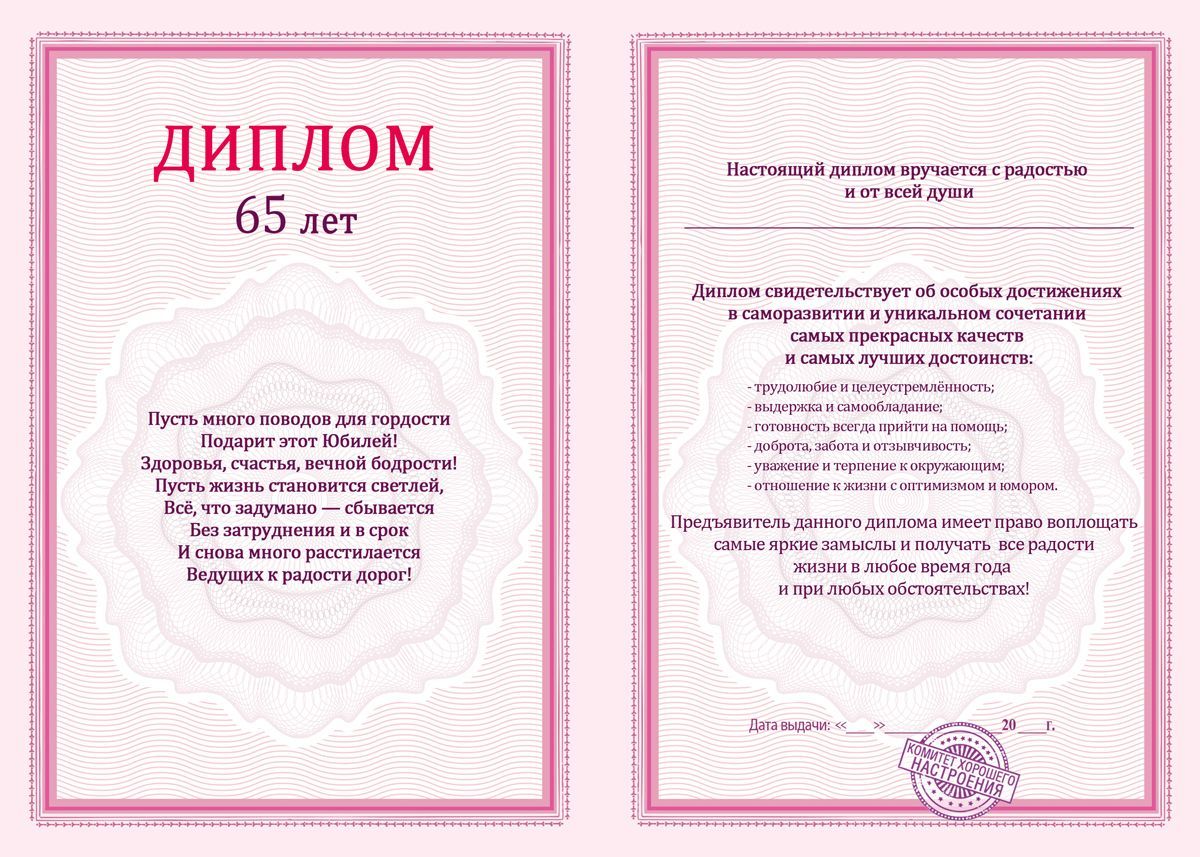 Диплом формата А6 предназначен для вручения к 65‑летию и рассчитан на использование в розничных и оптовых поставках для магазинов подарочной и канцелярской продукции, а также организаторов юбилейных мероприятий. Изделие выполнено из плотного картона, что обеспечивает достаточную жесткость, сохранение формы и устойчивость к механическим повреждениям при транспортировке и хранении в коробах или на витринных стойках. Готовый размер диплома составляет 160 × 110 мм, что удобно для выкладки в стандартных лотках и подвесных экспозициях, а также для размещения в конвертах или подарочных пакетах. На лицевой стороне размещено название «Диплом» и крупное обозначение возраста «65» в центральной части, оформленное с применением золотой фольги, создающей четкий, хорошо читаемый акцент и повышающей износостойкость печати. Дополнительную защиту поверхности обеспечивает глянцевая ламинация, уменьшающая риск истирания и выцветания красок при частом контакте и длительном хранении на складе или в торговом зале. Фон лицевой стороны выполнен в розово‑лиловой гамме с флористическим орнаментом, цветами и декоративными элементами, что делает изделие визуально уместным для семейных и корпоративных поздравлений. Внутри предусмотрен печатный текст и поле‑подсказка для вписывания имени юбиляра, даты, подписи и других индивидуальных данных, что облегчает работу продавцов и организаторов праздников, снижая необходимость в дополнительной полиграфии. Конструкция диплома оптимальна для массовых закупок: стандартный формат, стабильные размеры и отсутствие сложных элементов облегчают упаковку, штабелирование и учет. В одной упаковке 10 единиц, что позволяет формировать удобные для оптового клиента партии, быстро пополнять ассортимент и поддерживать единый стиль оформления юбилейных разделов. Изделие может использоваться как самостоятельный сувенир или как дополнение к подарку, подходит для вручения в домашней обстановке, в коллективах, клубах и организациях, где требуется формализованное, но компактное и аккуратное поздравление с 65‑летием.