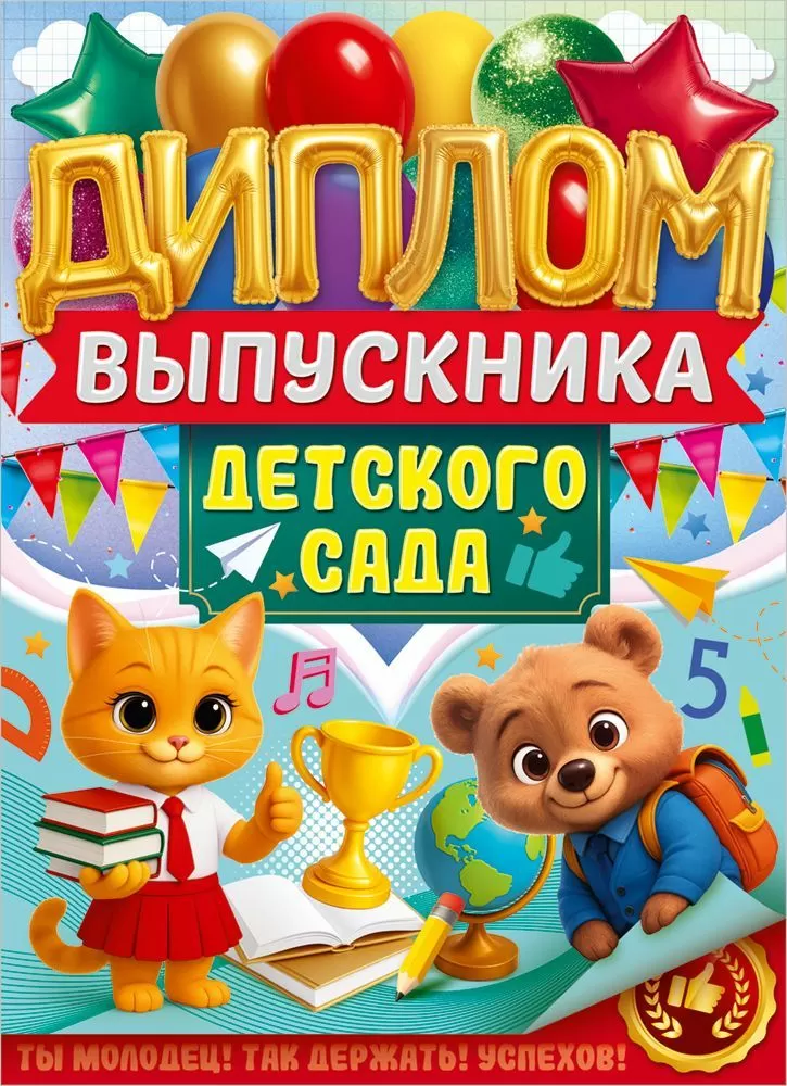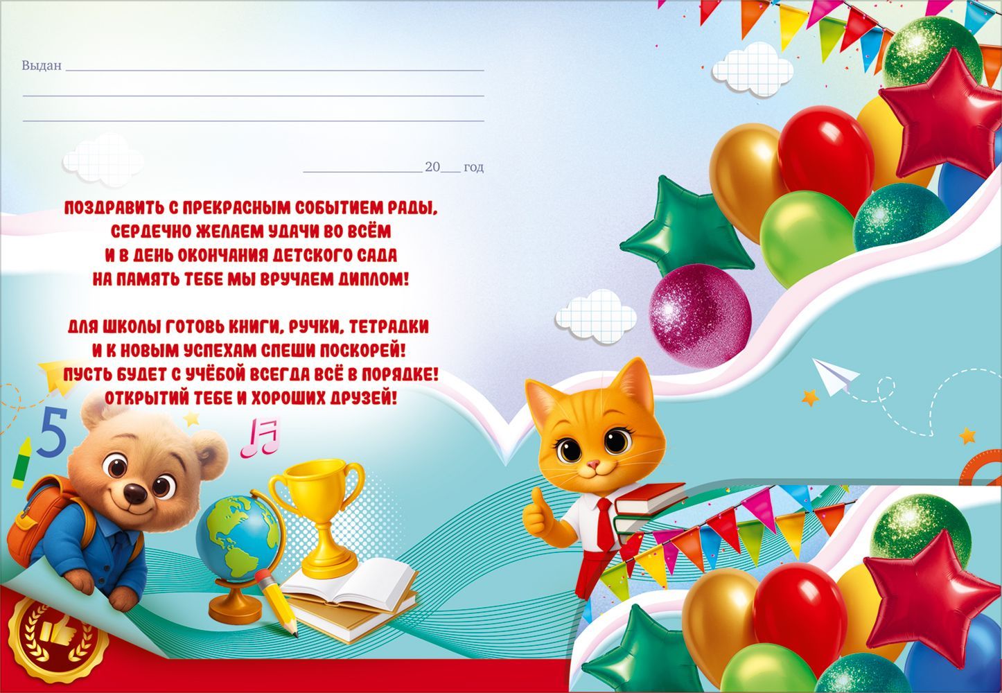 Диплом выпускника детского сада (кот, медведь, школьные предметы, воздушные шары)