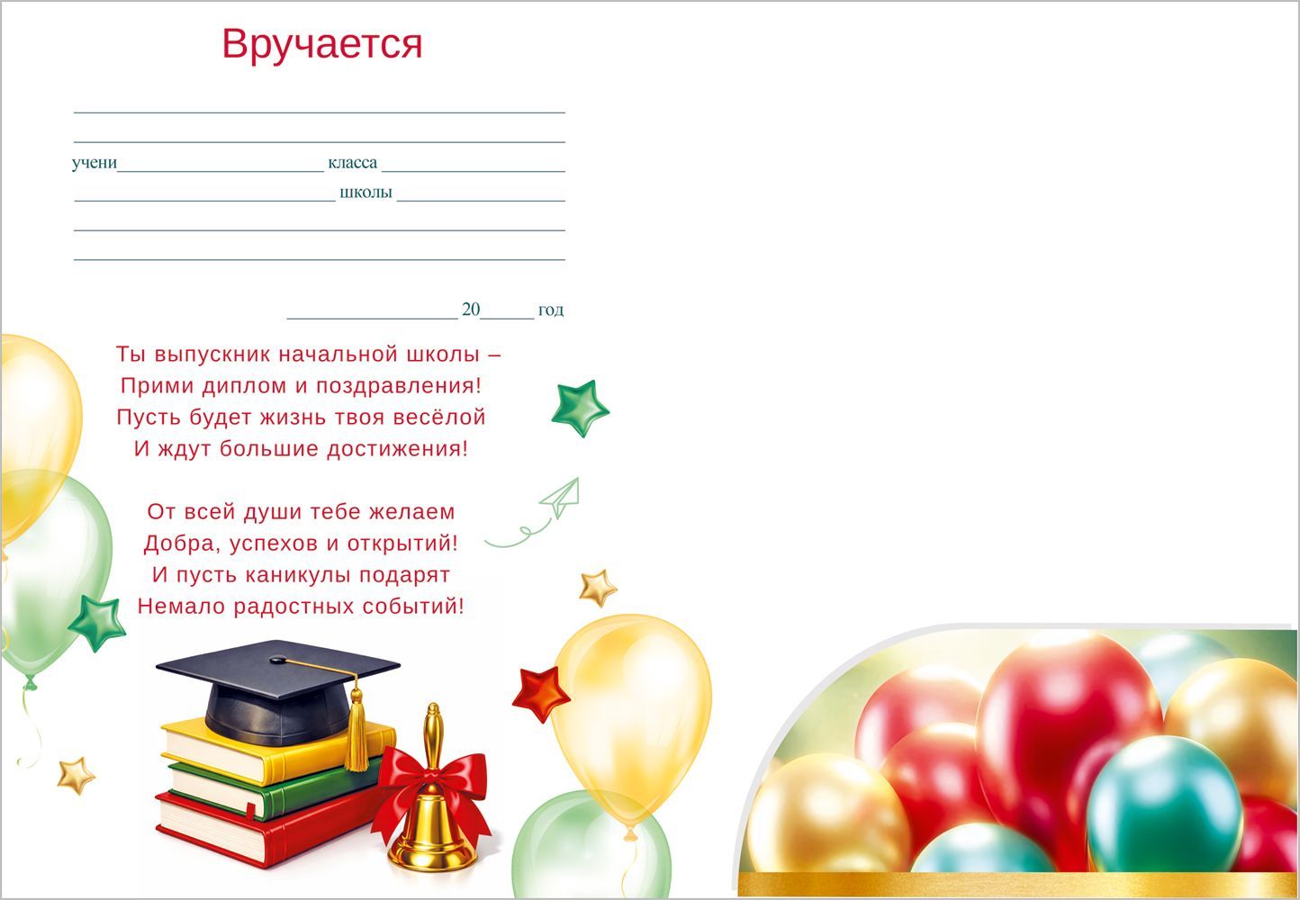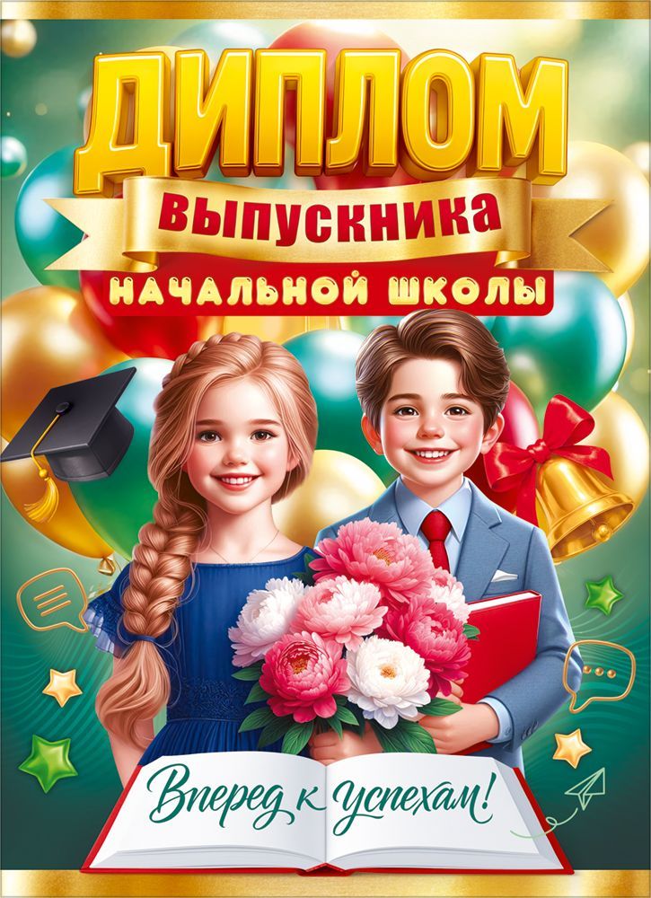 Диплом выпускника начальной школы (мальчик, девочка с букетом, книга, воздушные шары)