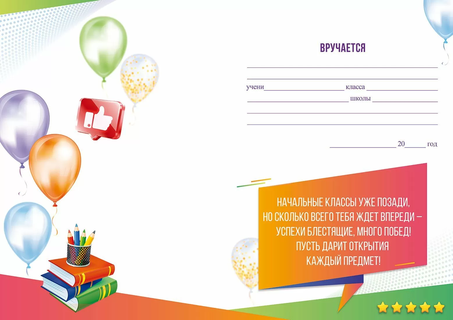 Изготовлено из плотного картона высокого качества. В комплекте 10 открыток формата А4, размер 277х196 мм. Яркий дизайн и поздравительный стих порадуют школьников. Есть разлиновка и шаблон для заполнения.