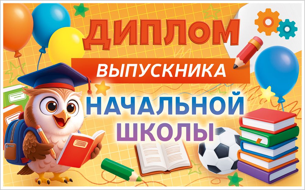 Диплом выпускника начальной школы с анкетой (сова, школьные предметы)