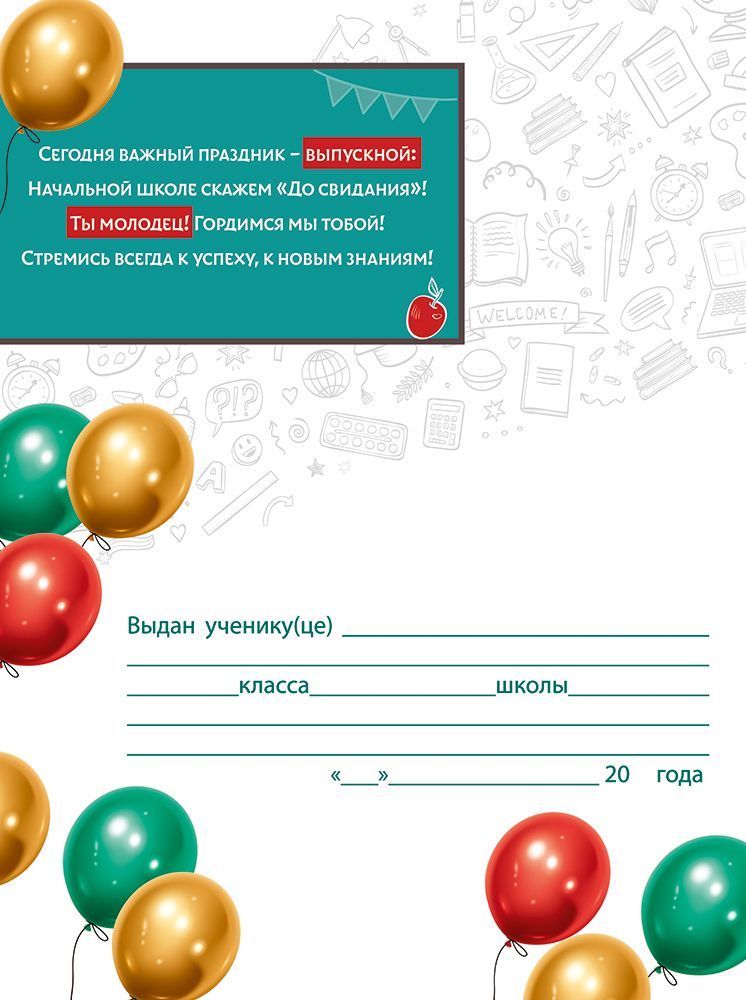 Диплом формата А5 предназначен для вручения выпускникам начальной школы и ориентирован на использование в образовательных учреждениях при проведении торжественных мероприятий. Изделие изготовлено из плотного картона, что обеспечивает устойчивость к изгибам, сохранение формы и аккуратный внешний вид при длительном хранении в архиве школы или семейном альбоме. Готовый размер диплома составляет 182 × 122 мм, что удобно для размещения в стандартных папках, конвертах или файловых вкладышах и оптимально при перевозке крупных партий. На лицевой стороне размещена полноцветная иллюстрация с изображением школьников и праздничной атрибутикой, а также надпись «Диплом об окончании начальной школы», хорошо читаемая с расстояния и подходящая для построения единого стилевого ряда при оформлении выпускного. Печать двусторонняя: оборотная сторона содержит текст и подсказ внутри для вписывания данных ученика, класса, учебного заведения, даты и подписи ответственных лиц, что упрощает заполнение при массовой выдаче и снижает риск ошибок. Поверхность оформлена глянцевым УФ-лаком, благодаря чему изображение защищено от истирания, обладает повышенной стойкостью к влаге и загрязнениям, а цвета выглядят более насыщенными и стабильными при искусственном и дневном освещении. Конструкция диплома удобна для упаковки стопками, не деформируется при транспортировке и подходит для централизованных поставок в школы, центры дополнительного образования и организации, проводящие детские программы. В розничном использовании изделие может применяться для семейных праздников, домашних награждений и фотосессий, при этом стандартные размеры и прочный картон позволяют дополнительно оформить диплом в рамку. В упаковке 10.