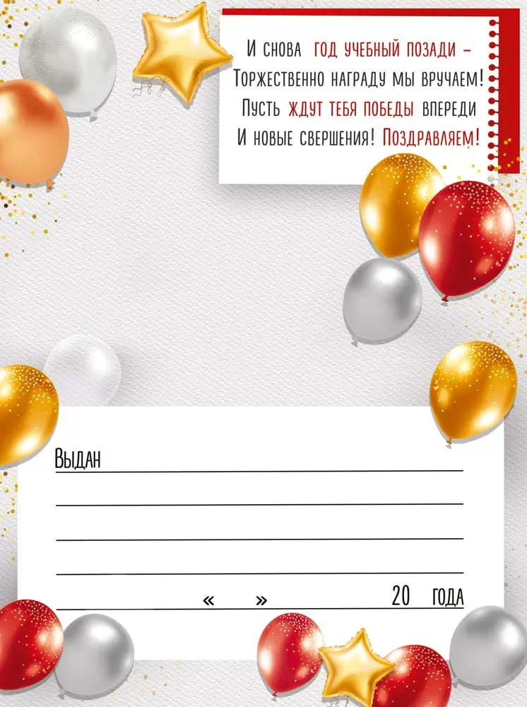 Диплом об окончании учебного года в формате А5 – это удобный и оригинальный способ поздравить школьника на выпускном вечере. Яркий дизайн сделает торжественное вручение ярким и незабываемым! Сочетание чистых белых, глубоких золотых и насыщенных красных оттенков создают неповторимую атмосферу и поддерживают торжественное настроение. Прямой классический шрифт, изображения воздушных шаров и сияние составляют эту необыкновенную композицию. Внутри – замечательные стихи с напутствием и специальная разметка, чтобы вписать там имя и фамилию ученика. Такой презент можно вручить в торжественной обстановке на выпускном. Изделие выполнено из качественных материалов, что обеспечивает ему прочность и долговечность, поэтому оно станет чудесным памятным сувениром для получателя.