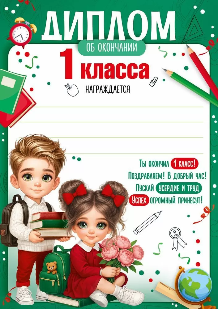 Диплом об окончании 1 класса (дети со школьными предметами)