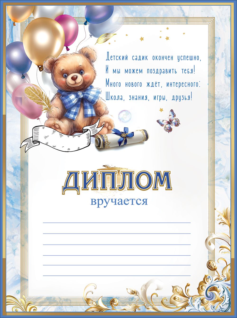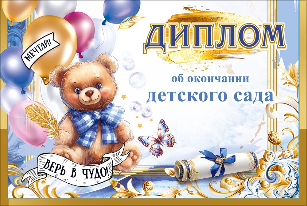 Диплом об окончании детского сада «Мечтай, верь в чудо!» (мишка с бантом, шары, перо, бабочка, свиток с бантом)