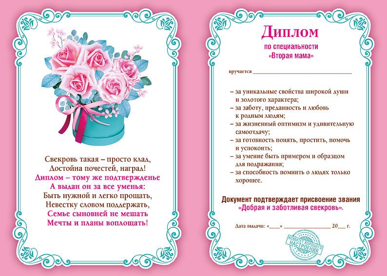 Диплом формата А6 «Диплом прекрасной свекрови» выполнен из плотного картона с глянцевой ламинацией и выборочным нанесением золотой фольги, что обеспечивает устойчивость к истиранию, сохранение яркости красок и аккуратный внешний вид при длительном хранении и транспортировке. Готовое изделие имеет размеры 160 × 110 мм, что облегчает складирование крупными партиями, размещение в стандартных коробах и выкладку на полках или у кассовой зоны. Лицевая сторона оформлена цветной композицией с букетом роз и декоративной рамкой, надпись основного названия выполнена с использованием золотой фольги, создающей чёткий визуальный акцент и хорошо читаемый текст при разном освещении. Внутри расположен печатный текст с готовой формулировкой поздравления и полями-подсказками для вписывания имени и подписи, что сокращает время обслуживания конечного покупателя и снижает риск порчи товара из‑за ошибок при заполнении. Структура картона подобрана таким образом, чтобы диплом сохранял жёсткость, не деформировался при вертикальной выкладке и не просвечивал при интенсивной двусторонней печати. Глянцевая поверхность дополнительно защищает от загрязнений и позволяет при необходимости аккуратно удалить лёгкие следы эксплуатации сухой мягкой салфеткой. Диплом ориентирован на использование в качестве готового подарочного решения для семейных праздников, юбилеев, дней рождения и других торжественных поводов, связанных с чествованием свекрови, хорошо сочетается с цветами, сладостями и сувенирной продукцией, что упрощает формирование комплексных наборов в ассортименте магазина. Компактный размер удобен для розничных покупателей: изделие легко помещается в стандартный почтовый конверт соответствующего формата или в подарочный пакет, не требует дополнительного оформления и может быть вручено как самостоятельный символический подарок. Упаковка содержит 10, что позволяет оптовым клиентам планировать закупки с учётом равномерной выкладки по торговым точкам, проводить сезонные и тематические акции и поддерживать стабильное наличие позиции в линейке поздравительных дипломов.
