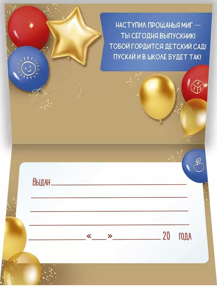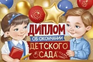Диплом «Об окончании детского сада» с яркими рисунками, изображением детей и воздушных шаров, напутственным стихотворением и пустыми строчками для заполнения информации о награждаемом. Подойдет для запечатывания на принтере.