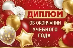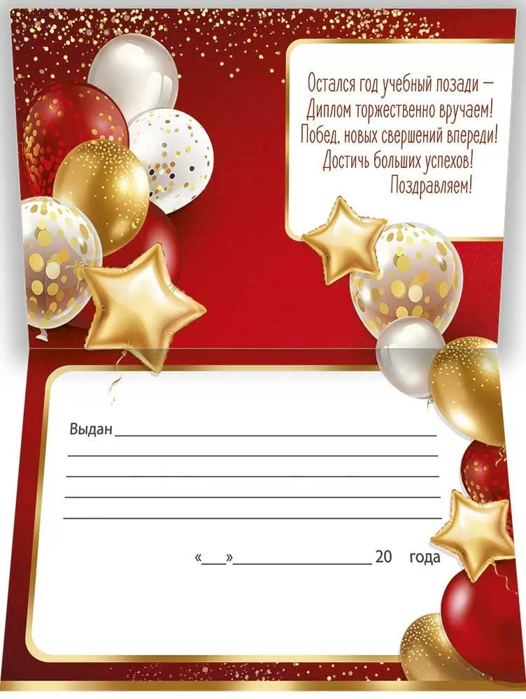 Диплом «Об окончании учебного года» с торжественным дизайном, с изображением воздушных шаров, конфетти, напутственным стихотворением и пустыми строчками для заполнения информации о награждаемом. Подойдет для запечатывания на принтере.