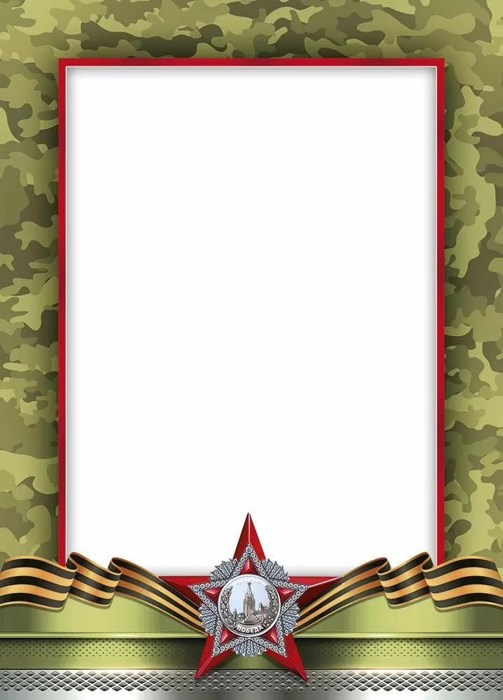 Пустая грамота-шаблон с патриотическим оформлением, георгиевской лентой и «Красной звездой» на 9 Мая. Подойдет для запечатывания на принтере.