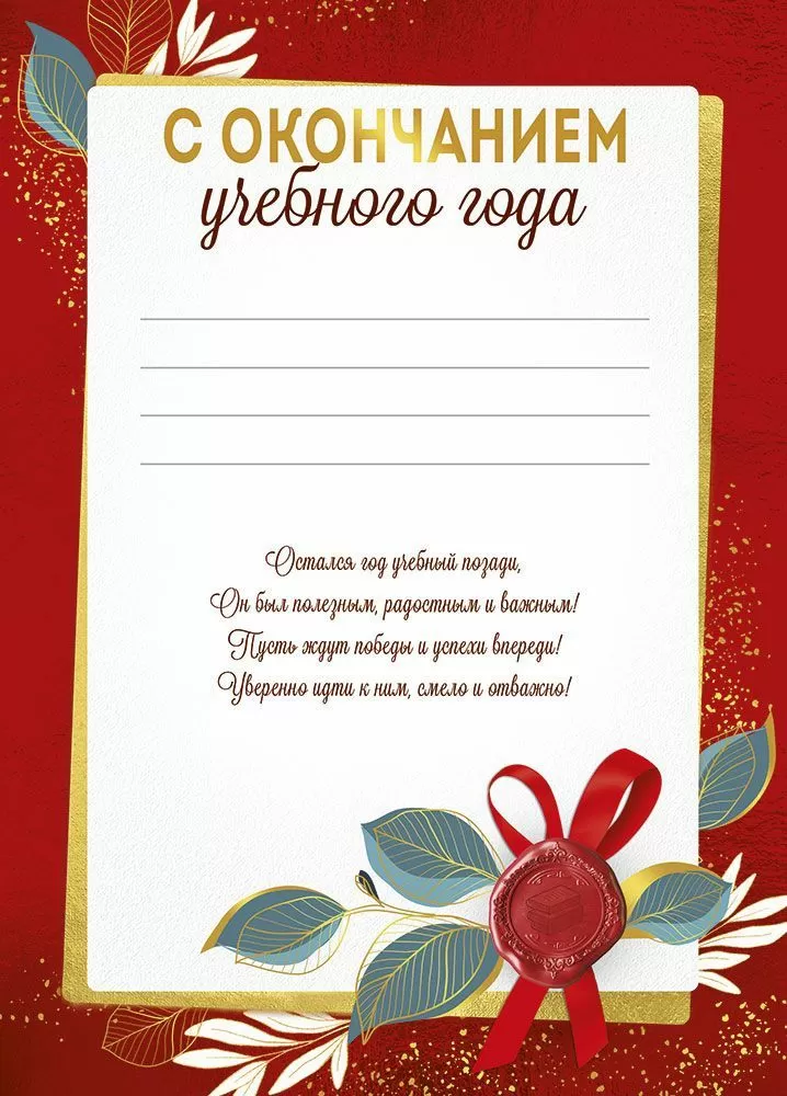 Разлинованная грамота-шаблон «С окончанием учебного года» с классическим дизайном и приятным стихотворением. Подойдет для запечатывания на принтере.