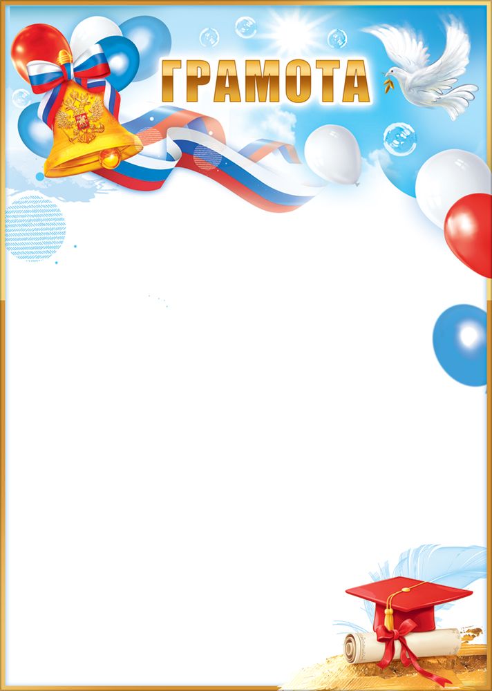 Грамота (колокольчик с лентой-триколор и гербом, выпускная шапочка, свиток, голубь, шары)
