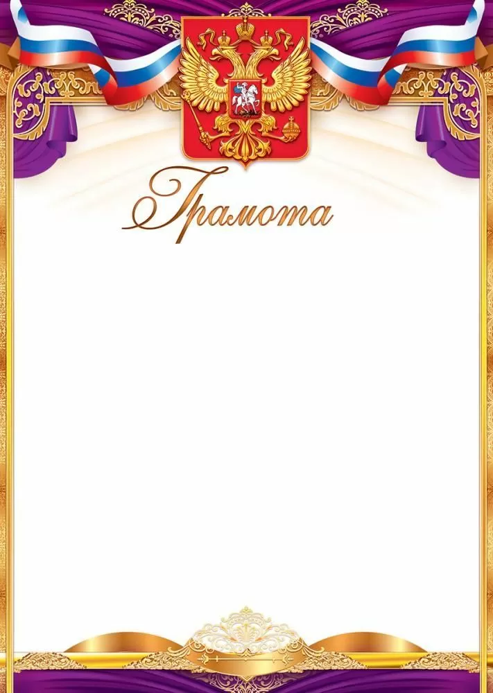 Торжественная грамота с российской символикой подойдет как для личного, так и для коллективного награждения. Подходит для принтера.