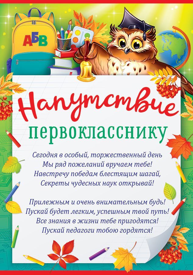 Печатное изделие «Напутствие» формата А5 представляет собой одностороннюю бумажную карточку с готовым красочным оформлением на тему начала учебного года и поступления в первый класс. Основа выполнена из плотной бумаги стандартной прямоугольной формы размером 210 × 148 мм, что обеспечивает совместимость с распространёнными папками, файлами и конвертами, а также удобство размещения в папках для документов, дневниках, альбомах и настенных экспозициях. Лицевая сторона содержит иллюстрацию с символикой школьной тематики: персонаж-совёнок в академической шапочке, учебные принадлежности, осенние листья и надпись «Напутствие первокласснику», дополненную поздравительным стихотворным текстом. Внутри дополнительного текста не предусмотрено, изделие не раскрывается, что упрощает складирование, фасовку и выдачу при массовых мероприятиях. Плотная бумага хорошо держит форму, устойчива к сгибам при аккуратном обращении, подходит для краткосрочного настенного размещения, вклеивания в альбомы и портфолио ученика. Отсутствие отделки облегчает транспортировку крупными тиражами, уменьшает риск повреждения поверхности и позволяет использовать стандартную упаковку без специальных условий хранения. Изделие ориентировано на применение в школах, детских садах, центрах дополнительного образования и развивающих студиях при проведении линеек 1 сентября, выпускных подготовительных групп и других событий, связанных с приёмом детей в первый класс. Карточка может вручаться индивидуально каждому ученику, использоваться как элемент набора первоклассника, вложение в подарочный пакет, дополнение к букету или памятный вкладыш в личное дело ребёнка. Для розничного покупателя изделие удобно как готовое решение для поздравления первоклассника без необходимости самостоятельной верстки и печати. Стандартный формат и ровные края позволяют при необходимости ламинировать карточку, оформлять в рамку или комбинировать с другими печатными материалами аналогичного размера. В упаковке 20 штук, что удобно для планирования закупок под численность класса или группы и формирования равномерного ассортимента в розничной выкладке.