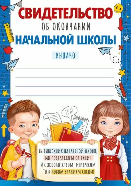 Свидетельство об окончании начальной школы — это замечательный сувенир для маленького выпускника. Качественное исполнение и яркий дизайн порадуют малыша. Документ будет напоминать ему о незабываемых годах, проведенных в начальной школе. Формат А5 (148х210 мм) делает свидетельство удобным для хранения. Бланк изготовлен из плотной бумаги, что обеспечивает долговечность и сохранность сувенира на протяжении многих лет. Великолепные иллюстрации с изображением радостных детей и школьных принадлежностей придают свидетельству неповторимый шарм. На бланке есть разлиновка для внесения данных учащегося. Поздравительное стихотворение подарит маленькому выпускнику радость и даст теплое напутствие. У нас можно приобрести подарочные свидетельства оптом. В одной упаковке — 20 штук. Переходите в каталог, где вас ждет еще больше потрясающей продукции — открытки, дипломы, плакаты и многое другое.