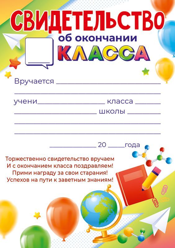 Свидетельство формата А5 предназначено для оформления торжественного вручения по итогам окончания класса в общеобразовательных учреждениях. Изделие выполнено из плотного картона, что обеспечивает стабильную форму, устойчивость к заломам при стандартном обращении и позволяет хранить документ в папках, файловых карманах или архивных коробках без дополнительного усиления. Размер 210×148 мм соответствует распространённым полиграфическим стандартам, что удобно при формировании смешанных партий с другой печатной продукцией и при транспортировке в коробах типовых форматов. Лицевая сторона содержит полноцветное оформление с яркими учебными и праздничными элементами, хорошо читаемым заголовком «Свидетельство об окончании класса» и структурированными текстовыми полями для вписывания фамилии и имени ученика, номера класса, наименования школы и даты вручения; предусмотрен готовый поздравительный текст и подсказки по заполнению, что упрощает массовую выдачу документов в школах и кружках. Обратная сторона может использоваться как чистое поле для дополнительных записей, печати учреждения или личных пожеланий. В упаковке 10 изделий, что удобно для планирования закупок под количество классов и параллелей, а также для поштучной выдачи при розничных продажах. Карточный материал оптимален для хранения в горизонтальных и вертикальных стопках без деформации, изделия не требуют специальных условий эксплуатации, допускают аккуратное заполнение шариковыми и гелевыми ручками без значительного просвечивания чернил. Свидетельство может использоваться как самостоятельный поощрительный документ или как часть комплекта к выпускному мероприятию начальной школы, легко интегрируется в существующий ассортимент праздничной и учебной полиграфии.