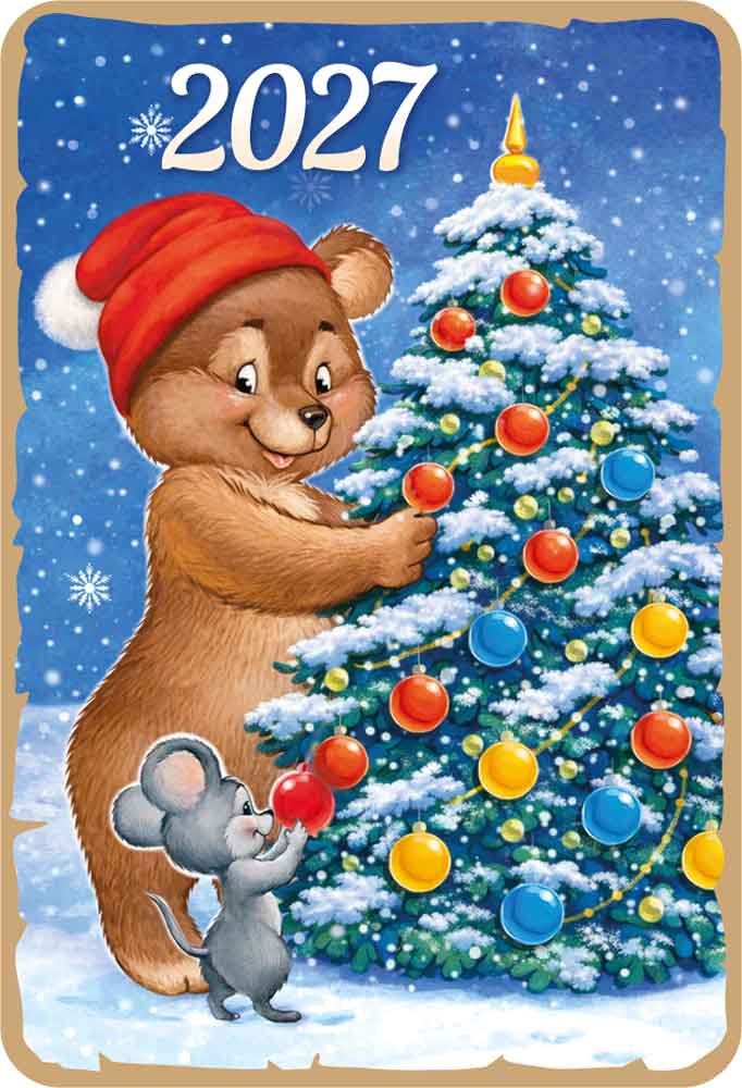 Календарь карманный 2027 «Ретро» (мишка и мышка наряжают елку)