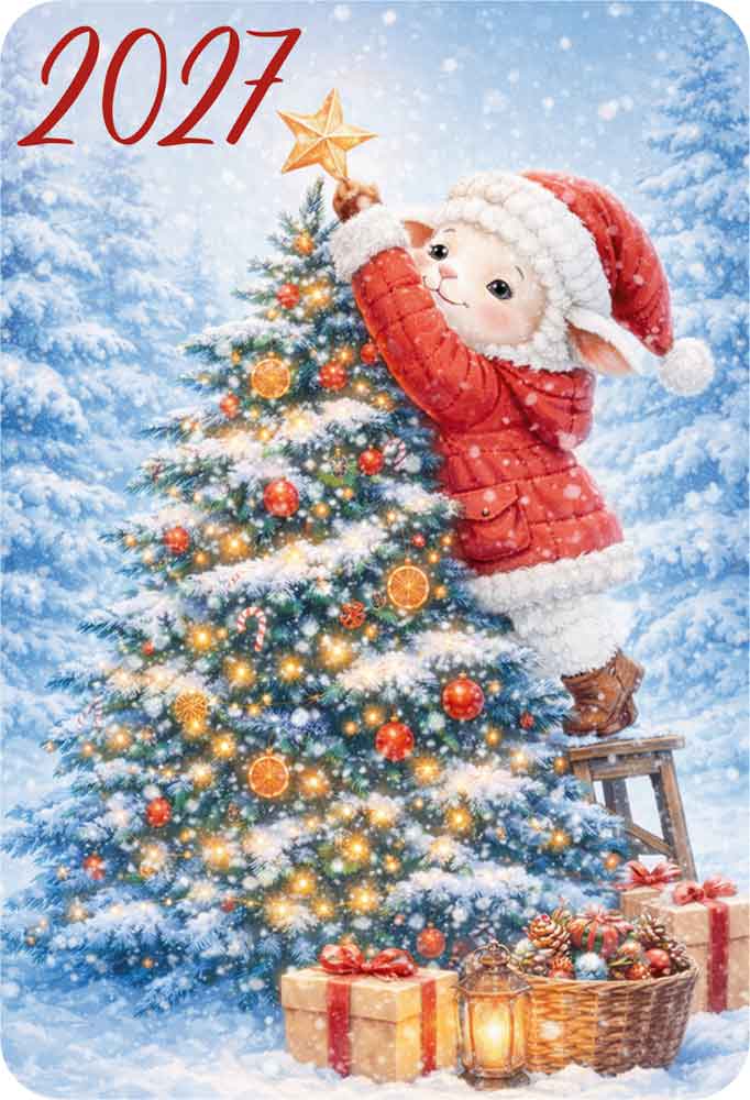 Календарь карманный 2027 «Овечки новогодние» (овечка наряжает елку)