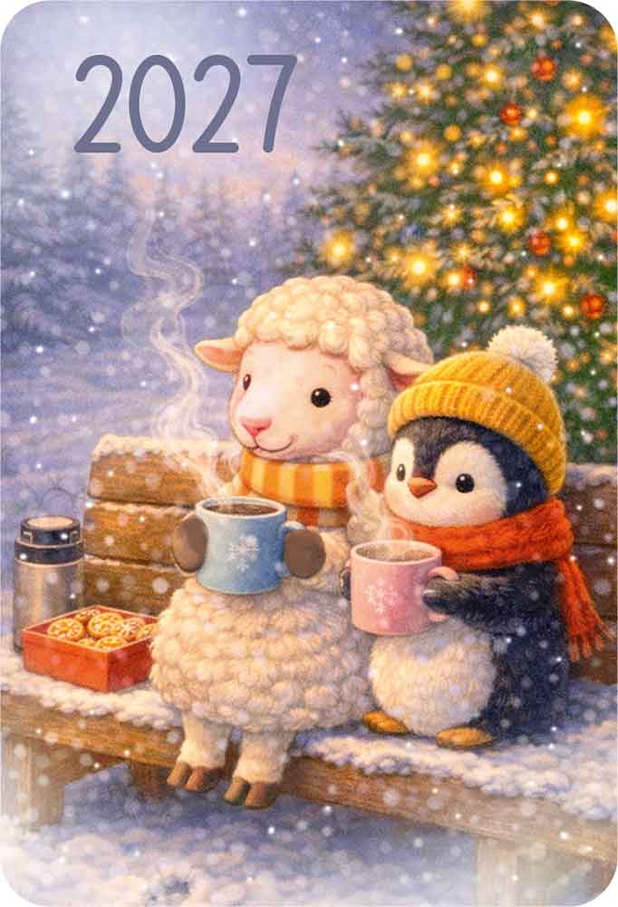Календарь карманный 2027 «Ретро овечки» (овечка с пингвином на лавочке)