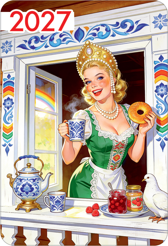 Календарь карманный на 2027 год (девушка в кокошнике с чайным сервизом и голубем)