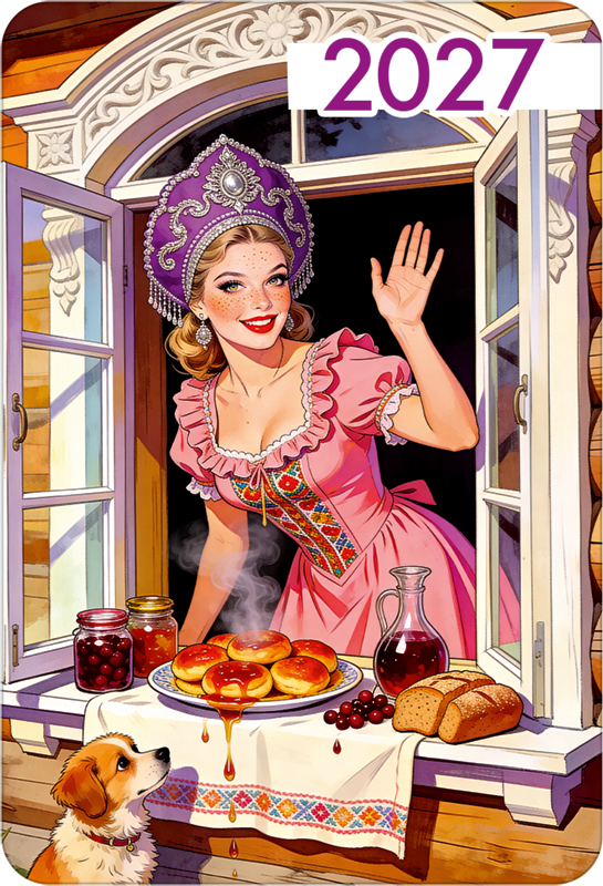 Календарь карманный на 2027 год (девушка в кокошнике с тарелкой оладушек и собакой)