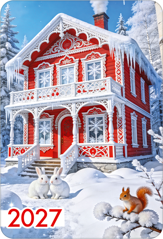 Календарь карманный на 2027 год (зимний терем с зайчиками и белочкой)