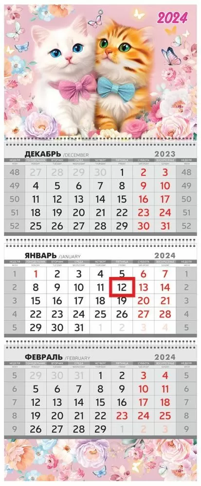 Календарь квартальный трехблочный состоит из верхнего постера, а также трех одинаковых по размеру календарных блоков на 1 месяц.