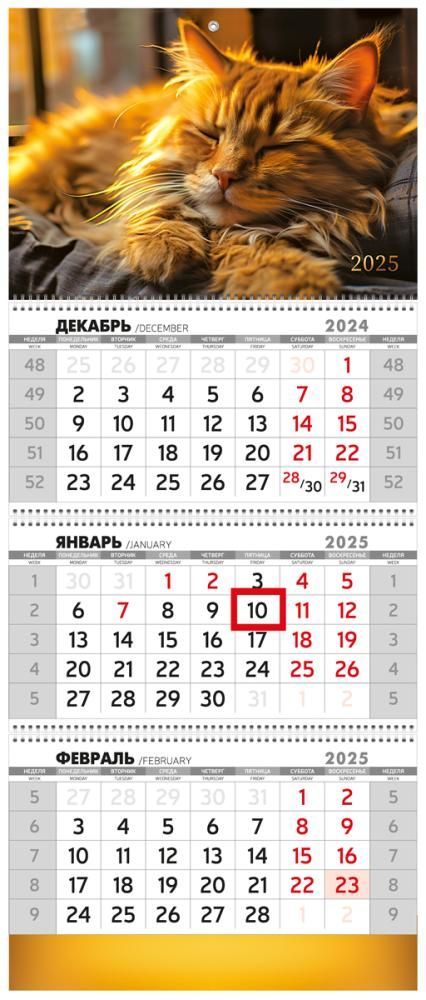 Календарь квартальный трехблочный формата А1 предназначен для настенного размещения в офисах, торговых и сервисных зонах, на производственных и складских объектах, а также в домашних интерьерах. Основа изготовлена из плотного картона, обеспечивающего достаточную жесткость конструкции и устойчивость к деформации при длительной эксплуатации в течение года. Трехблочная структура позволяет одновременно просматривать предыдущий, текущий и последующий месяцы, что удобно при планировании графиков работ, поставок, отпусков и личных дел. Каждый блок содержит крупную, хорошо читаемую сетку с выделением выходных и праздничных дней, что облегчает использование календаря в рабочих зонах с различными режимами сменности. Конструкция выполнена на пружине, что упрощает перелистывание блоков без разрывов и перекосов, и оснащена курсором для оперативного выделения текущей даты; перемещение курсора происходит по направляющим плавно, без повреждения бумаги. На верхнем поле размещено изображение с тематикой домашнего животного, формирующее нейтральный, ненавязчивый визуальный акцент, подходящий для большинства офисных и бытовых интерьеров. Календарь не содержит дополнительного текста внутри, что делает его универсальным решением для компаний разных профилей и исключает конфликт с фирменным стилем при размещении рядом с корпоративной навигацией или информационными стендами. Формат А1 обеспечивает хорошую видимость дат с расстояния, что особенно актуально для открытых офисных пространств и торговых залов. Картонная основа устойчива к стандартным условиям хранения и транспортировки, допускает штабелирование при оптовых поставках и удобна для размещения в единичной транспортной упаковке. Количество в упаковке: 1.