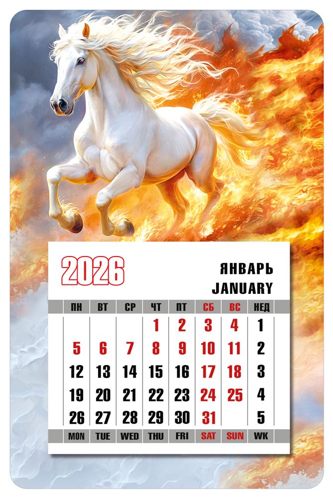 Календарь магнитный формата А6 предназначен для размещения на металлических поверхностях и удобного планирования текущего месяца в бытовых и офисных условиях. Основа изделия выполнена из магнитного винила, обеспечивающего надежное прилегание к холодильникам, металлическим шкафам, стеллажам, доскам и другим ферромагнитным поверхностям, что важно при формировании ассортимента для офисных центров, торговых сетей и HoReCa. Лицевая сторона изготовлена из мелованной бумаги с полноцветной печатью и глянцевой ламинацией, повышающей износостойкость, устойчивость к истиранию и кратковременному контакту с влагой, а также сохраняющей яркость изображения при длительной эксплуатации. На верхней части размещена иллюстрация с белой лошадью на динамичном фоне, нижняя часть отведена под календарный блок на 2026 год с выделением выходных и двуязычным обозначением месяца и дней недели, что удобно для деловой переписки и планирования графиков работы. Конструкция с отрывным блоком позволяет по мере завершения периода удалять использованные листы, поддерживая актуальность информации и аккуратный внешний вид. Габаритные размеры готового изделия составляют 145 мм по длине и 95 мм по ширине, что облегчает хранение, группировку по артикулам и транспортировку крупными партиями, а также позволяет размещать календарь на ограниченных по площади поверхностях. В упаковке 10 единиц, формат поставки удобен для оптовых закупок, формирования выкладки и распределения по торговым точкам или рабочим местам. Календарь не содержит дополнительного текста внутри, что делает его универсальным решением для использования в качестве недорогого корпоративного сувенира, раздаточного материала на мероприятиях, а также для повседневного применения в доме, офисе, на складе или в сервисных зонах.