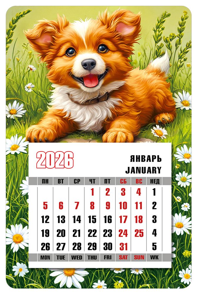 Календарь магнитный формата А6 предназначен для размещения на металлических поверхностях и удобного планирования текущего месяца. Основа изделия выполнена из магнитного винила, обеспечивающего надежное удержание на холодильнике, металлической двери, стеллаже или офисной доске, что важно при частой эксплуатации в торговых и офисных помещениях. Лицевая сторона изготовлена из плотной мелованной бумаги с полноцветной печатью: в верхней части размещено изображение щенка на фоне ромашкового поля, нижняя часть отведена под календарную сетку на 2026 год с выделением выходных дней и дублированием названий месяца и дней недели на русском и английском языках, что удобно для розничных покупателей и для использования в многоязычной рабочей среде. Поверхность защищена глянцевой ламинацией, повышающей износостойкость, устойчивость к истиранию и влаге, что позволяет сохранять читаемость и внешний вид при ежедневном контакте и упрощает влажную уборку. Конструктив изделия включает отрывной блок календарных листов, что обеспечивает актуальность информации в течение всего года и делает календарь практичным инструментом для планирования смен, графиков поставок, акций или личных дел. Размеры готового изделия составляют 145 мм в длину и 95 мм в ширину, что облегчает хранение и транспортировку крупными партиями, позволяет эффективно использовать торговое пространство и формировать ассортиментную выкладку по серии изображений. В упаковке 10, что удобно для оптовых закупок, формирования небольших розничных партий, корпоративной раздачи или комплектации подарочных наборов. Отсутствие дополнительного текста внутри предоставляет возможность использовать календарь как универсальный сопутствующий товар для магазинов подарков, канцелярии, зоотоваров и сувенирной продукции, а также как нейтральный элемент оформления дома, офиса или точки продаж.
