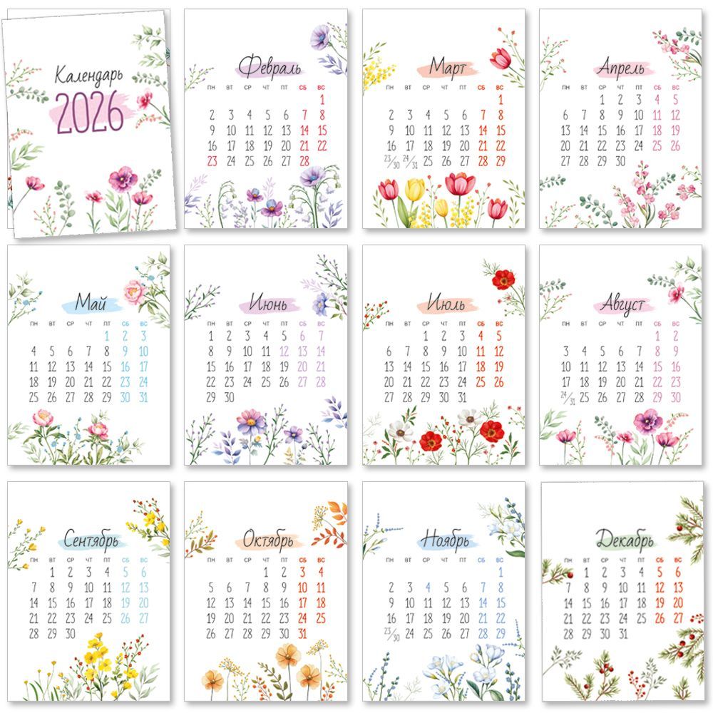 Настольный календарь формата А7 выполнен из плотного дизайнерского картона и рассчитан на использование в течение всего 2026 года. Комплект включает 14 отдельных элементов: обложку с обозначением года и 12 месячных листов с календарной сеткой, а также дополнительный лист для размещения на подставке или для вводной информации, при необходимости наносимой заказчиком самостоятельно. Каждый элемент имеет точные размеры: длина 123 мм и ширина 90 мм, что обеспечивает совместимость с большинством стандартных настольных подставок и позволяет компактно размещать календарь на рабочем столе, стойке ресепшн, в торговой зоне или на кассовом узле. Печать выполнена в цвете: на лицевой стороне размещена календарная сетка с выделением выходных и праздничных дат, фон оформлен ненавязчивыми флористическими иллюстрациями в едином стиле, что облегчает формирование согласованной линейки сувенирной и канцелярской продукции. Внутри элементы не содержат текста, что оставляет свободное поле для брендирования, нанесения логотипа, контактных данных или служебных пометок при корпоративных и оптовых заказах. Дизайнерский картон обеспечивает достаточную жесткость и устойчивость листов к изгибам, истиранию и выцветанию при повседневной эксплуатации в офисе или дома, а также сохраняет геометрию при длительном хранении на складе и многократной транспортировке. Компактный формат и ровные края удобны для групповой упаковки, фасовки по наборам и последующей рассылки клиентам или партнерам в качестве делового календарного сувенира. Для розничного использования календарь подходит как настольное решение для планирования дел, учебных задач и личных событий, легко размещается рядом с компьютером или блокнотом, не загромождая пространство. Универсальный нейтральный дизайн с растительными мотивами делает изделие применимым в офисных, торговых и домашних интерьерах, а единый стиль всех 14 элементов упрощает включение календаря в ассортимент подарочной, канцелярской или корпоративной продукции. Количество в упаковке: 1.