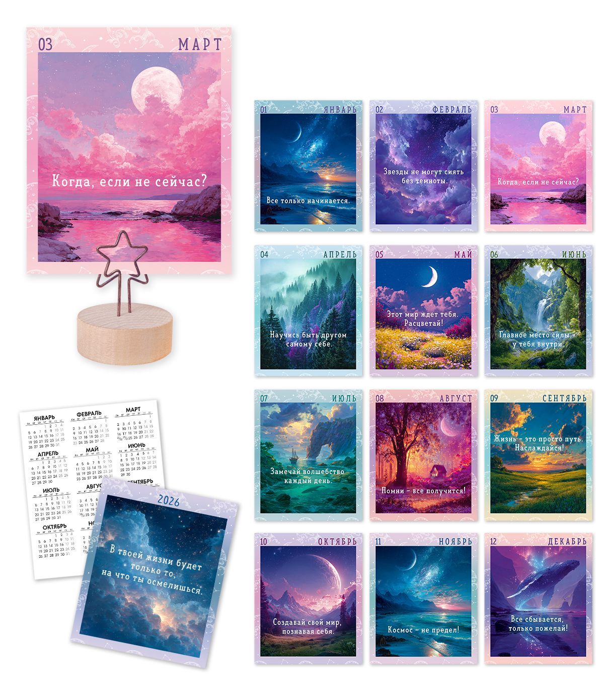 Настольный календарь формата А6 представляет собой комплект карточек на 2026 год с текстовой информацией и иллюстрациями, установленный на компактном держателе. Основа и карточки выполнены из плотного картона, что обеспечивает стабильную форму, устойчивость к изгибам и износу при ежедневном использовании на рабочем столе или стойке ресепшн. Габариты готового изделия составляют 140 × 88 мм, что удобно для размещения на ограниченном пространстве: рядом с монитором, телефоном, кассовым оборудованием, в зоне выдачи заказов. Конструкция на держателе позволяет быстро менять отображаемый месяц, при этом карточки фиксируются вертикально и остаются хорошо читаемыми с обычного расстояния работы за столом. Календарный блок включает 12 месяцев 2026 года и дополнительную бонусную карточку, на лицевой стороне размещены изображения в тематике «Знаки Вселенной» и короткие текстовые фразы, на обороте или отдельным блоком нанесена сетка дней месяца с выделением выходных. Для оптовых закупщиков важна удобная логистика: изделие поставляется в единичном количестве, имеет малый вес и плоскую упаковку, что облегчает хранение на складе, формирование ассортимента и выкладку в торговом зале, а также позволяет оптимизировать транспортные расходы при больших партиях. Календарь может использоваться как недорогой сопутствующий товар в канцелярских, книжных и сувенирных отделах, в интернет‑магазинах и корпоративных закупках для оснащения рабочих мест. Для розничного пользователя изделие выполняет функцию наглядного планирования месяца и одновременно декоративного элемента: иллюстрации и текст создают визуально завершенную композицию, которая подходит для дома, офиса, учебного стола или подарочного набора. Универсальный дизайн и компактный формат делают календарь уместным в большинстве интерьерных и деловых сценариев, а картонная основа обеспечивает достаточную долговечность в течение всего заявленного периода использования.