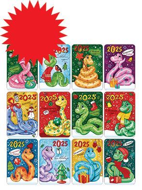 Набор карманных календарей на 2025 год с изображением символа года – змеи. В наборе 12 отличающихся календарей с разными изображениями и дизайном. Формат: А7. Материал: картон. Размер: 6х9 сантиметров.