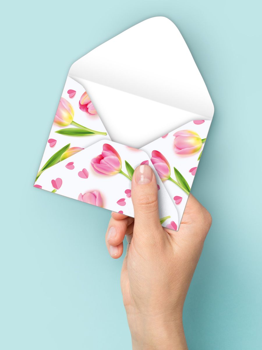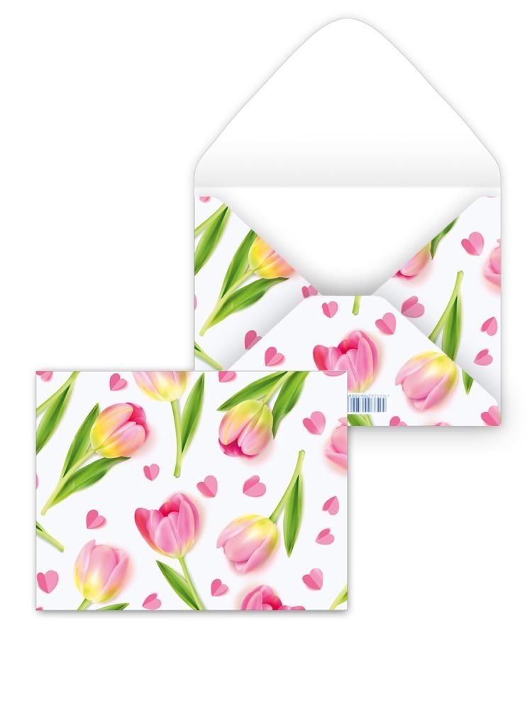 Конверт художественный формата А6 изготовлен из плотной белой бумаги с полноцветной печатью по внешней стороне. Размер готового изделия 115 × 90 мм обеспечивает совместимость с большинством стандартных поздравительных и вложенных открыток, а также с небольшими вкладышами, сертификатами и печатной полиграфией аналогичного формата. Бумага подобрана таким образом, чтобы сохранять форму конверта при транспортировке и хранении, не деформироваться при стандартной нагрузке в почтовых отправлениях и не просвечивать содержимое. Внешняя поверхность оформлена рисунком с тюльпанами и небольшими розовыми сердцами на светлом фоне; внутренняя сторона без печати, что позволяет использовать конверт в сочетании с любыми стилями открыток и вложений. Отделка без дополнительных декоративных элементов, что упрощает укладку в коробки и стеллажи, снижает риск повреждения при штабелировании и делает изделие универсальным для разных поводов. Конверт поставляется по 20 штук, что удобно для формирования оптовых партий, планирования остатков и равномерного распределения по торговым точкам. Конструкция клапана рассчитана на аккуратное закрытие, обеспечивает плотное прилегание и визуально завершает композицию рисунка. Внутри конверт без текста, поэтому может применяться в розничных продажах для поздравлений с днями рождения, свадеб, семейных и сезонных праздников, а также в корпоративных рассылках, вручении бонусных купонов и подарочных сертификатов. Компактный размер и стандартная геометрия облегчают хранение на складе и в розничной выкладке, позволяют использовать конверт как самостоятельную товарную позицию или как дополнение к открыткам и подарочной продукции.
