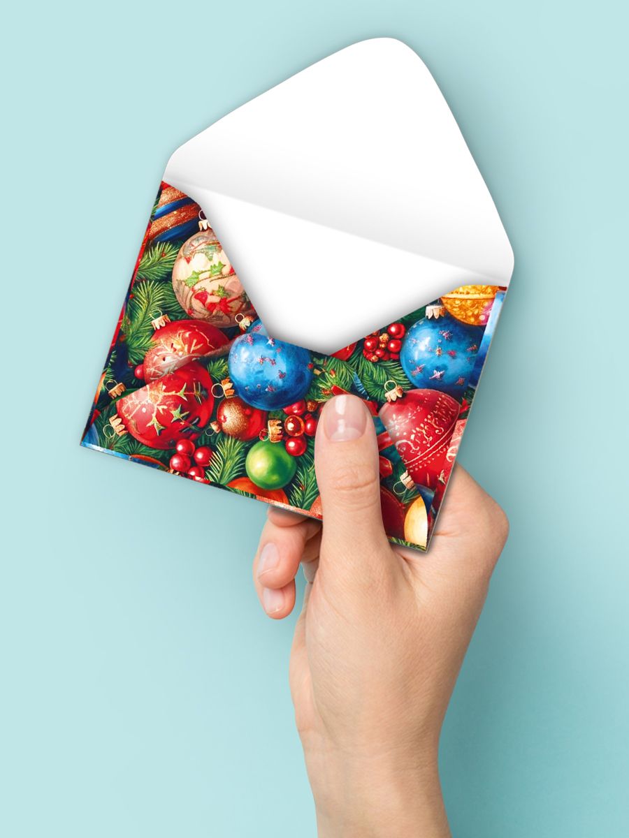Конверт художественный формата А6 изготовлен из плотной бумаги и предназначен для упаковки поздравительных открыток, вложения подарочных сертификатов, небольших печатных материалов и вложений к новогодним наборам. Лицевая сторона оформлена полноцветным художественным изображением новогодних еловых ветвей с разноцветными шарами и ягодами, что позволяет использовать изделие в сезонных коллекциях, при оформлении праздничных рассылок и корпоративных подарков. Внутренняя поверхность без текста, что удобно для универсального применения в оптовых партиях: один и тот же конверт подходит для разных категорий клиентов, языковых регионов и сценариев использования, от розничных продаж до вложения в наборы сувенирной продукции. Размер готового изделия 115 × 90 мм обеспечивает совместимость с большинством стандартных мини-открыток и вкладышей, а также удобен при сортировке, упаковке и хранении на складе. Бумажный материал хорошо держит форму, позволяет аккуратно вкладывать полиграфическую продукцию и не утяжеляет почтовые отправления, что важно при массовых почтовых кампаниях. Отделка без дополнительных эффектов снижает риск повреждений при транспортировке, упрощает штабелирование и не требует специальных условий хранения, что удобно для оптовых закупок с длительным оборотом. Нейтральный, но узнаваемый новогодний сюжет делает конверт подходящим как для корпоративного, так и для частного дарения: его можно использовать для вручения денежных подарков, бонусных купонов, дисконтных карт, вложения небольших поздравительных записок к подарочным наборам. В одной упаковке 20 конвертов, что позволяет формировать оптимальные по объёму партии для розничной выкладки, комплектования подарочных коробок и организации сезонных акций без излишков на складе.