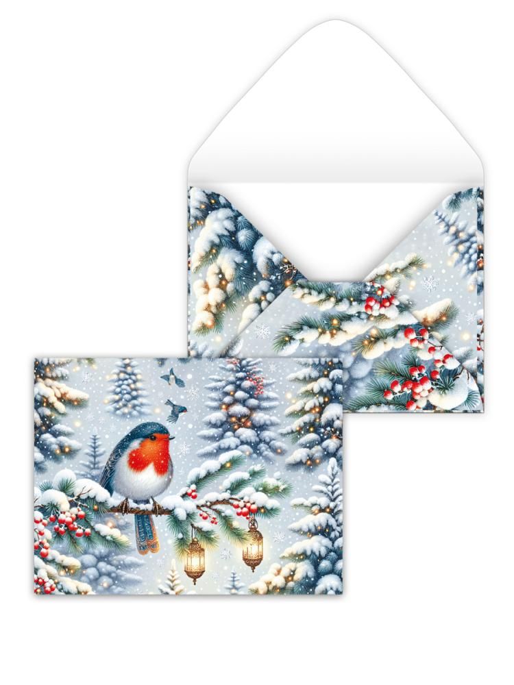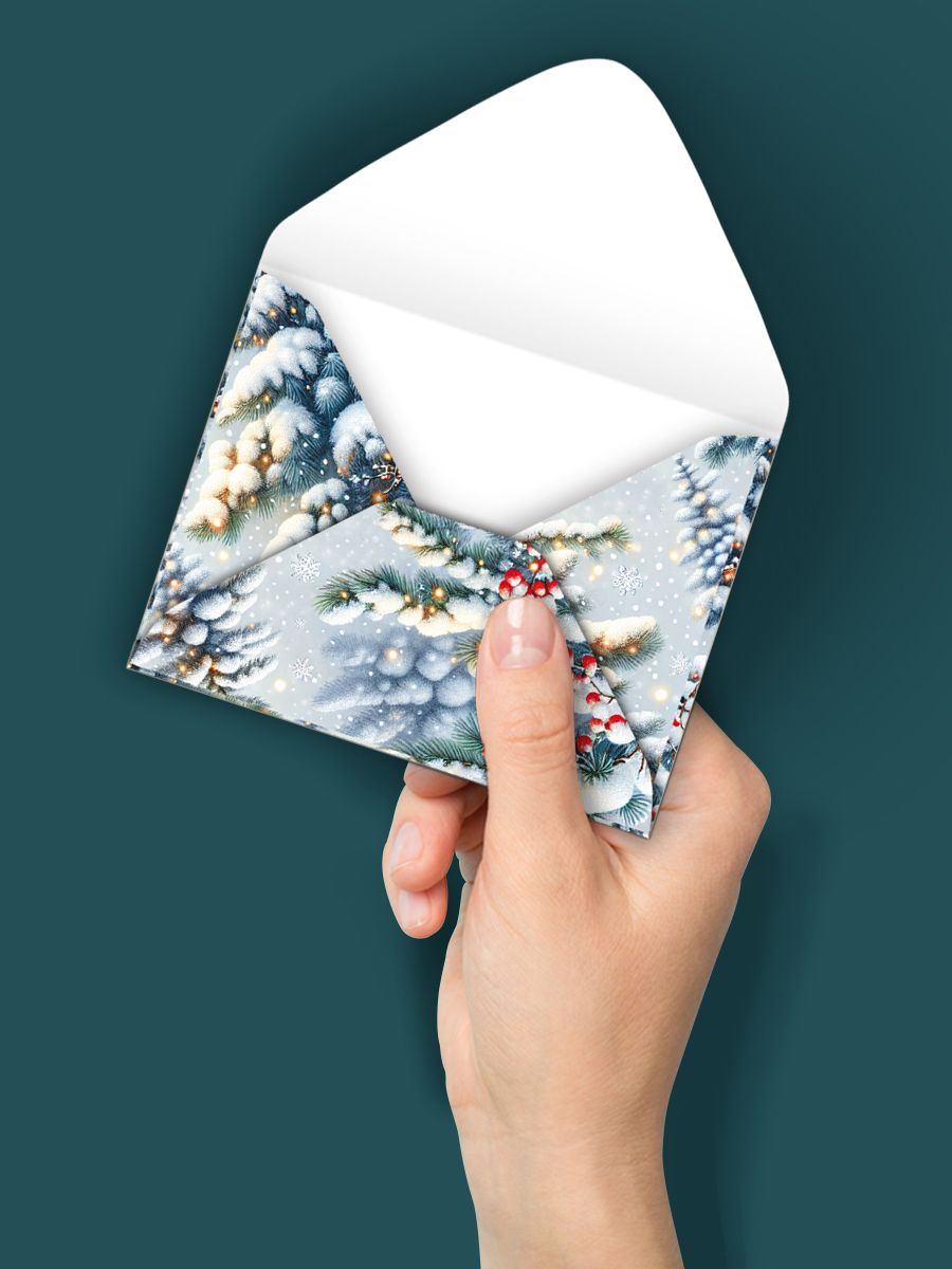 Конверт художественный формата А6 выполнен из плотной белой бумаги, предназначенной для качественной полноцветной печати и устойчивой к стандартным нагрузкам при пересылке и хранении. Готовое изделие имеет размеры 115 × 90 мм, что обеспечивает совместимость с большинством тиражируемых поздравительных открыток, вложений и полиграфической продукции малого формата, используемой в розничной и корпоративной коммуникации. На лицевой стороне размещена детализированная зимняя композиция: хвойный лес, покрытый снегом, ветви с красными ягодами, декоративные фонари и птица с ярким оперением на переднем плане; фон дополнен снежинками и мягкими световыми акцентами, благодаря чему конверт визуально выделяется в витрине и подходит для сезонных коллекций, новогодних и зимних ассортиментных линеек. Внутренняя часть без текста, что упрощает использование в различных сценариях: для личных поздравлений, корпоративной рассылки, упаковки подарочных сертификатов, вложения рекламных материалов или небольших сувениров. Бумажная основа обеспечивает удобство ручной подписи, нанесения печатей, штампов и стикеров, не деформируется при аккуратном сгибе и не просвечивает стандартные вложения. Отсутствие отделки делает конверт универсальным для оптовых закупок: он совместим с автоматизированными линиями упаковки и сортировки, не требует специальных условий хранения, устойчив к нормальной влажности и перепадам температуры при транспортировке в коробах. Упаковка 20 штук оптимальна для формирования розничной выкладки, комплектования подарочных наборов, распределения по торговым точкам и использования в офисах, гостиницах, студиях оформления и сервисных службах, где важна единая стилистика зимних и праздничных коммуникаций без жёсткой привязки к конкретному событию.