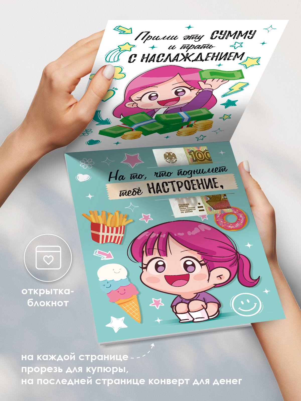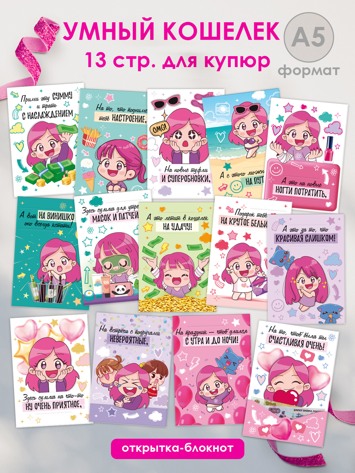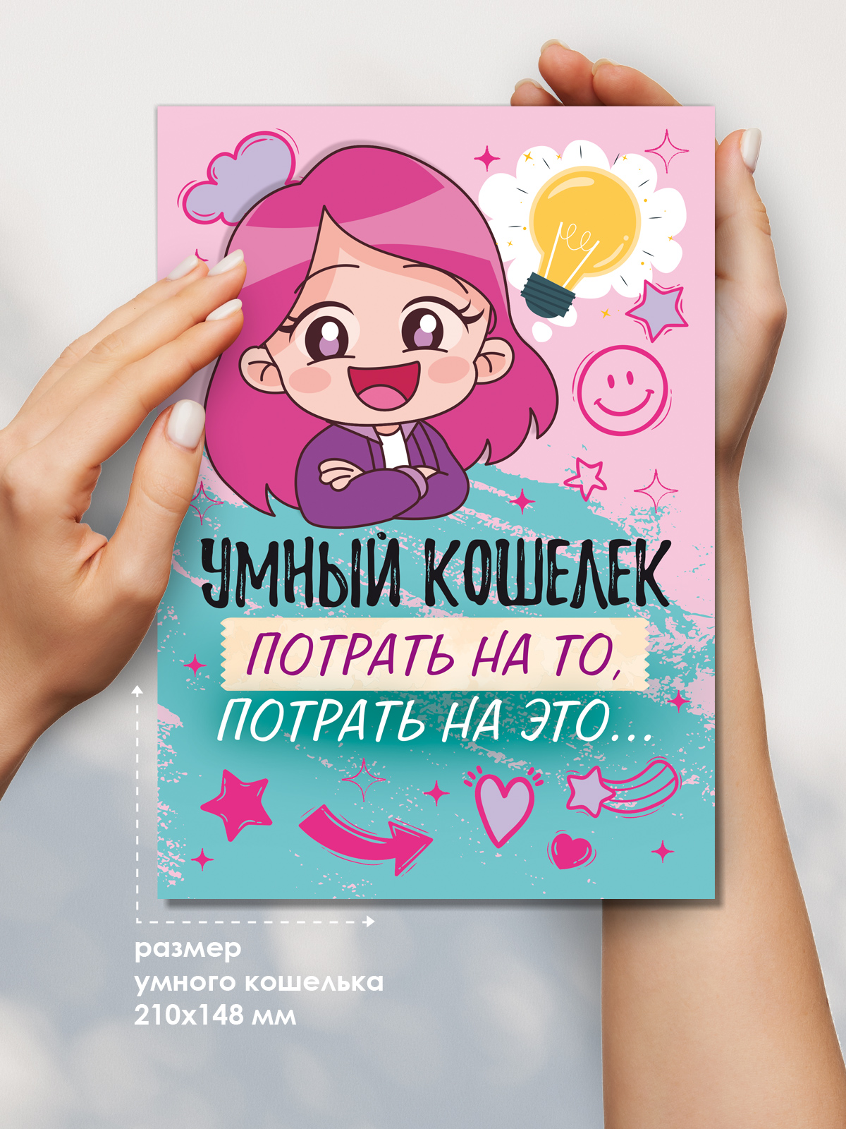 Картонный кошелек формата А5 «Умный кошелек. Потрать на то, потрать на это…» представляет собой изделие с печатным оформлением и внутренним карманом/клапаном для размещения купюр, мелких вложений или подарочных сертификатов. Готовый размер кошелька составляет 210 × 148 мм, что обеспечивает совместимость с большинством стандартных конвертов и упаковочных решений, удобно при формировании ассортимента для розничных сетей и интернет-магазинов. Основа выполнена из плотного картона, устойчивого к многократному открыванию и закрыванию, что важно при использовании изделия как временного детского кошелька, подарочной упаковки для денег или элемента финансовых игр. На внешней стороне размещен полноцветный печатный рисунок в яркой подростковой стилистике с персонажем и надписями, внутри предусмотрен текстовый контент и структурированное деление по страницам (13 страниц), позволяющее использовать кошелек как мини-блокнот для планирования личных расходов, фиксации желаний и целей. Конструкция с карманом/клапаном обеспечивает надежную фиксацию вложенных купюр и небольших плоских предметов, снижает риск выпадения при транспортировке и выкладке на витрине. Изделие удобно для оптовых закупок: стандартный формат упрощает хранение на складе, укладку в короба и паллеты, а картонная основа не требует специальных условий содержания, кроме защиты от влаги и прямого намокания. Кошелек ориентирован преимущественно на детскую и подростковую аудиторию, подходит как дополнение к подарку, как недорогой самостоятельный сувенир или инструмент для обучения базовым навыкам обращения с деньгами. В розничном использовании изделие может применяться для вручения наличных на день рождения, выпускной, тематические праздники, а также для организации домашних игр и конкурсов. В упаковке: 1.