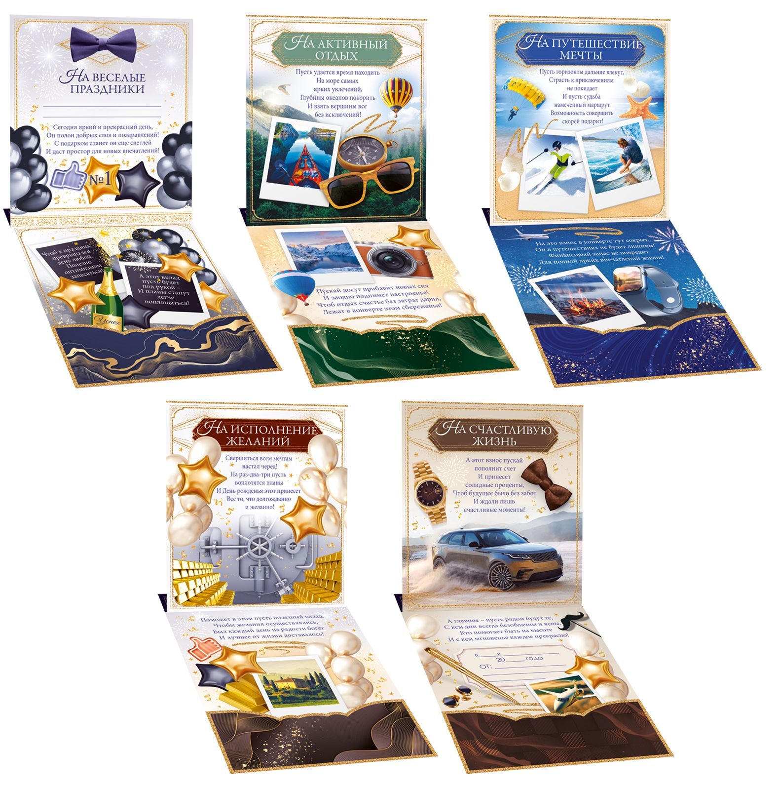 Подарочная сберкнижка формата А5 представляет собой изделие из плотного картона с фигурной вырубкой, оформленное под мужской костюм с бабочкой и надписью «Сберегательная книжка. Вклад “С Днем Рождения”». Готовый размер изделия составляет 215×163 мм, что удобно для размещения в стандартных пакетах и конвертах, а также для выкладки на полке или в прикассовой зоне. Конструкция включает атласную ленту и внутренний карман-клапан для размещения денежных купюр или подарочных сертификатов, что позволяет использовать сберкнижку как универсальный денежный конверт с жесткой основой. Внутри предусмотрен печатный текст поздравительного характера, оформленный в едином стиле с обложкой, что сокращает время подготовки подарка и делает изделие готовым к вручению без дополнительного декорирования. Картон обладает достаточной жесткостью для сохранения формы при транспортировке и хранении, не деформируется при стандартных нагрузках, что важно для оптовых поставок и складского учета. Поверхность печати устойчива к истиранию при аккуратной эксплуатации, цвета насыщенные, с преобладанием темно-синей и золотистой гаммы, что визуально подчеркивает «премиальный» характер денежного подарка и подходит для поздравления мужчин разного возраста. Конструкция ориентирована на разовое праздничное использование, но при бережном обращении может служить в качестве памятного сувенира. Формат и толщина изделия позволяют формировать плотные транспортные пачки без значительного риска повреждений краев. В упаковке 1 изделие, что удобно для розничной продажи поштучно и для оптовых заказов с точным планированием количества на каждое мероприятие или торговую точку. Такая сберкнижка применяется как альтернативный вариант открытки и конверта для денег на день рождения, сочетая функцию поздравления и аккуратной презентации денежного вклада.