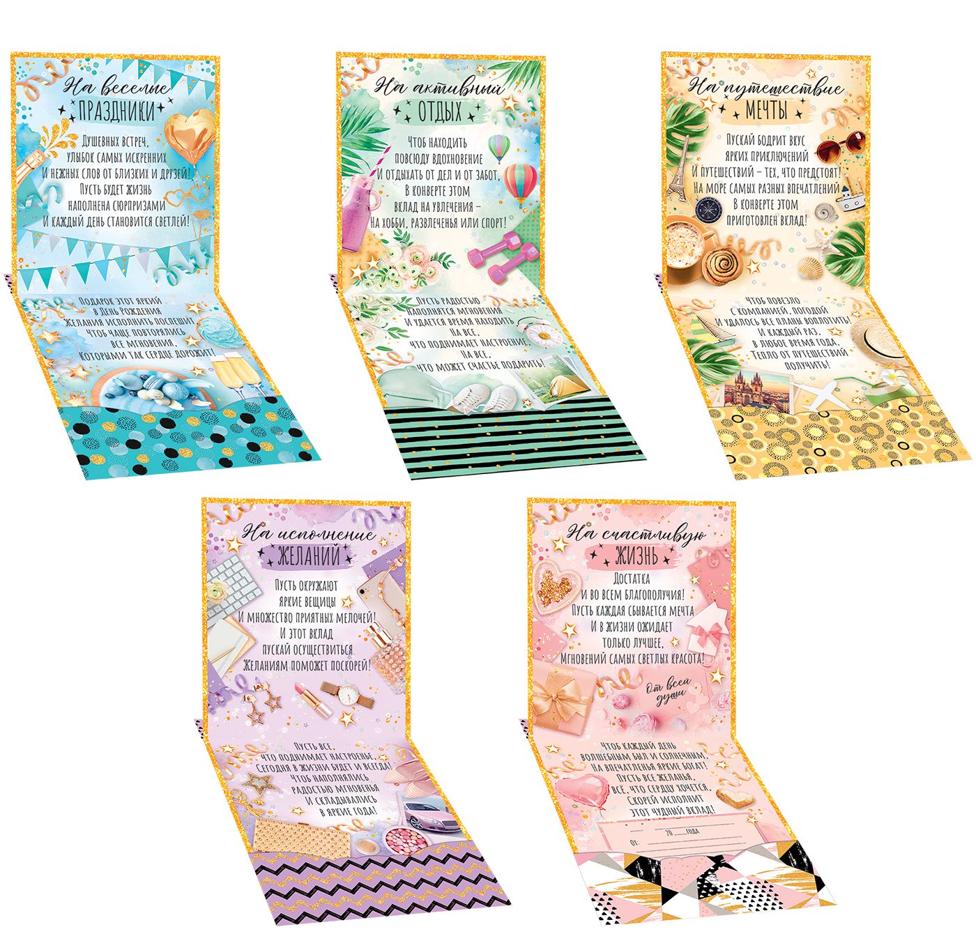 Сберкнижка формата А5 представляет собой подарочное изделие из плотного картона с фигурной вырубкой, рассчитанное на оформление денежного подарка к дню рождения. Готовое изделие имеет размеры 215 × 163 мм, что удобно для размещения стандартных купюр без сгибов и деформации. Конструкция включает внутренний карман-клапан для денег, который фиксирует вложение и защищает его от выпадения при транспортировке и демонстрации, что важно при оптовых закупках для розничных точек и интернет-магазинов. На лицевой стороне нанесён полноцветный тематический дизайн с надписями «Вклад “С Днём Рождения!”», «Сберегательная книжка», «Банк праздничный», оформленный в праздничной стилистике с изображениями цветов, воздушных шаров, десертов и декоративных элементов. Внутри предусмотрен печатный текст поздравительного характера, позволяющий использовать изделие как самостоятельный подарок без необходимости дополнительной открытки. Материал изготовления — картон с высококачественной печатью, устойчивой к истиранию при стандартных условиях хранения и выкладки, что обеспечивает сохранение внешнего вида при многократном просмотре покупателями. Наличие атласного банта в верхней части изделия усиливает подарочную функцию и позволяет позиционировать товар в ассортименте как готовое решение для вручения денежных средств на праздник. Конструкция и формат удобны для размещения на настенных и прикассовых витринах, в напольных стойках и стандартных коробах; изделие не требует сборки, поставляется в готовом к продаже виде. В упаковке — 1 изделие, что даёт возможность формировать ассортимент поштучно, оптимизируя остатки и выкладку в зависимости от спроса. Сберкнижка подходит для дарения взрослым и подросткам, используется как декоративный конверт для денег и одновременно как памятный сувенир, который может храниться как элемент домашнего архива подарков.