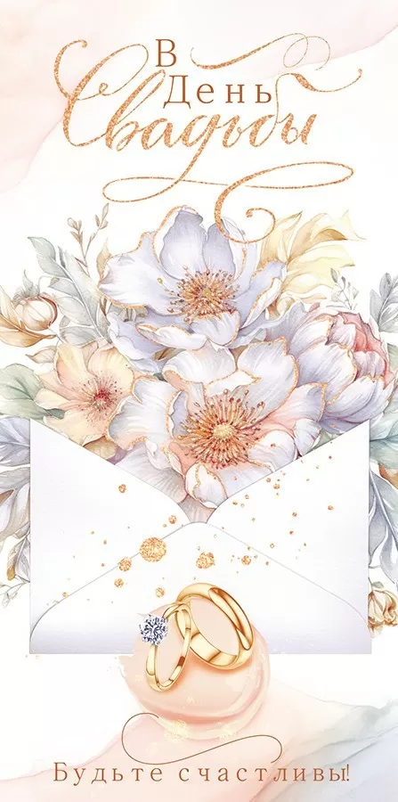Оригинальный конверт для денег поможет красиво оформить свадебный подарок для молодоженов. Изысканный дизайн в нежных тонах подчеркнет романтичную атмосферу торжества. Очаровательный рисунок дополнен золотыми блестками и поздравительным текстом. Идеальный сюрприз для жениха и невесты!