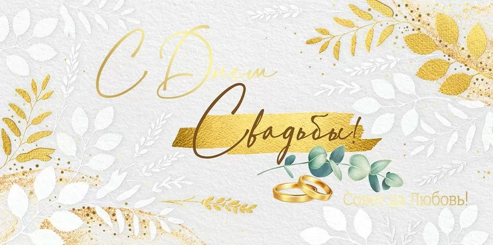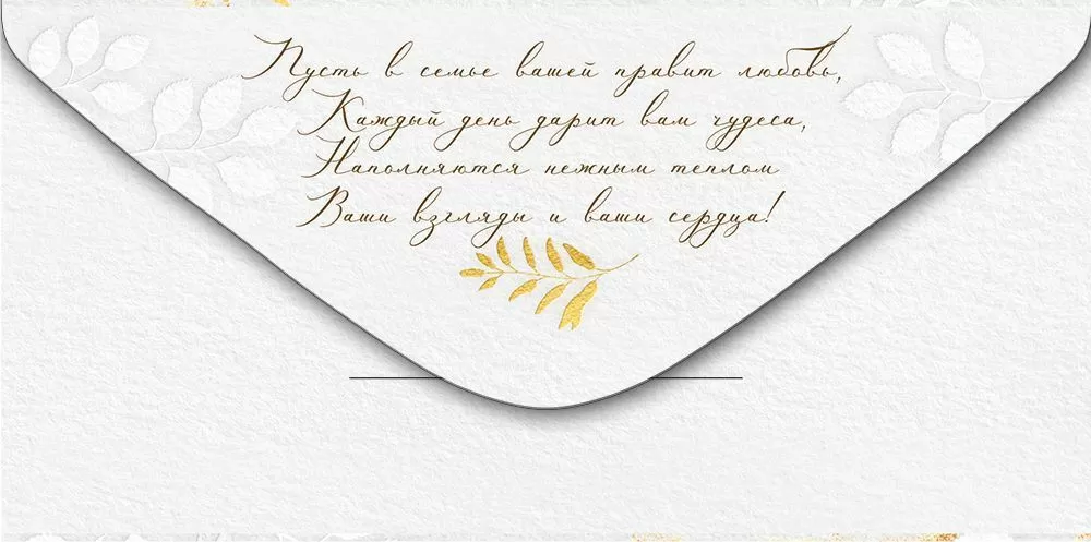 Изысканный конверт для денег «С днем свадьбы!» подарит молодоженам праздничное настроение и самые яркие эмоции! Конверт станет замечательным дополнением к денежному презенту. Очаровательный дизайн в светлых тонах, золотая фольга и теплые пожелания — идеальный сюрприз для жениха и невесты на свадьбу!