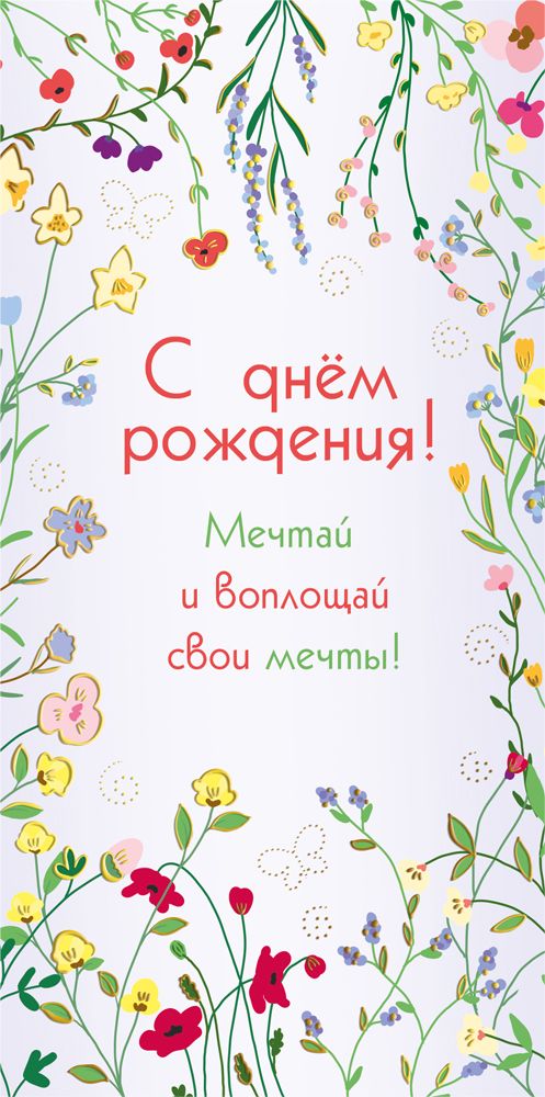 Конверт для денег формата евро предназначен для оформления денежных подарков к дню рождения и рассчитан на использование в розничной продаже и оптовых поставках. Изделие изготовлено из плотного картона, обеспечивающего стабильную геометрию при хранении и транспортировке, а также устойчивость к изгибам и истиранию в процессе эксплуатации. Готовый размер конверта составляет 168 × 84 мм, что удобно для размещения стандартных банкнот без сгибания и позволяет закладывать внутрь подарочные сертификаты соответствующего формата. Лицевая сторона оформлена цветочной композицией с надписью «С днём рождения! Мечтай и воплощай свои мечты!», что делает конверт тематически универсальным для поздравления взрослых и детей. Декорирование выполнено с использованием золотой фольги и глянцевого УФ-лака: фольга образует акцентные контуры отдельных элементов рисунка, УФ-лак придаёт выборочный блеск и дополнительную защиту от истирания, что важно при частом перекладывании продукции на витрине и в коробах. Внутри конверта нет текста, что облегчает адаптацию под различные сценарии вручения подарка и позволяет розничным покупателям самостоятельно вписывать пожелания любого объёма. Для оптового сегмента нейтральное внутреннее оформление упрощает включение позиции в широкий ассортимент поздравительной продукции без привязки к полу или возрасту получателя. Конверт поставляется по 10 штук, что удобно для учёта и формирования складских остатков, оптимально заполняет стандартные транспортные короба и снижает риск повреждений при перевозке за счёт плотной укладки. Используемые материалы и отделка обеспечивают стабильное качество внешнего вида, сохраняют яркость печати и читаемость надписей на протяжении всего срока реализации.