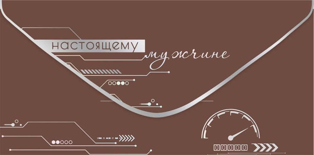 Конверт для денег формата евро предназначен для вручения денежного подарка и сертификатов стандартного размера и ориентирован на мужскую тематику. Изделие выполнено из плотного картона, что обеспечивает стабильную форму, устойчивость к изгибам и удобство штабелирования при оптовом хранении и транспортировке. Готовый размер конверта составляет 168×84 мм, что позволяет точно планировать выкладку в торговом оборудовании и укладку в стандартные кассеты и боксы. Внешняя сторона оформлена в коричнево-шоколадной гамме с технологичными графическими элементами и надписью «настоящему мужчине», акцентированной серебряной фольгой; такая отделка повышает износостойкость печати и создает выраженный контраст при искусственном и естественном освещении. Применение лака soft-touch формирует матовую, тактильно мягкую поверхность, устойчивую к мелким царапинам и истиранию, что важно при многоразовом перекладывании товара на складе и в торговом зале. Внутренняя часть конверта без текста, что упрощает универсальное использование в рознице и опте: изделие подходит для поздравлений с днем рождения, профессиональными и календарными праздниками, юбилеями, поощрениями сотрудников и деловых партнеров. Конструкция рассчитана на стандартный способ вложения купюр без сгибания и обеспечивает надежное удержание содержимого при переноске. Фигурная вырубка придает краю клапана аккуратный декоративный контур и облегчает открывание, сохраняя при этом точную геометрию и повторяемость формы во всей партии. Поверхность картона пригодна для подписей шариковой или гелевой ручкой, что позволяет персонализировать поздравление при единичной и массовой выдаче. В упаковке 10. Такой формат удобен для формирования ассортимента в сетевой и розничной торговле, а также для закупок в корпоративный фонд подарочной продукции.