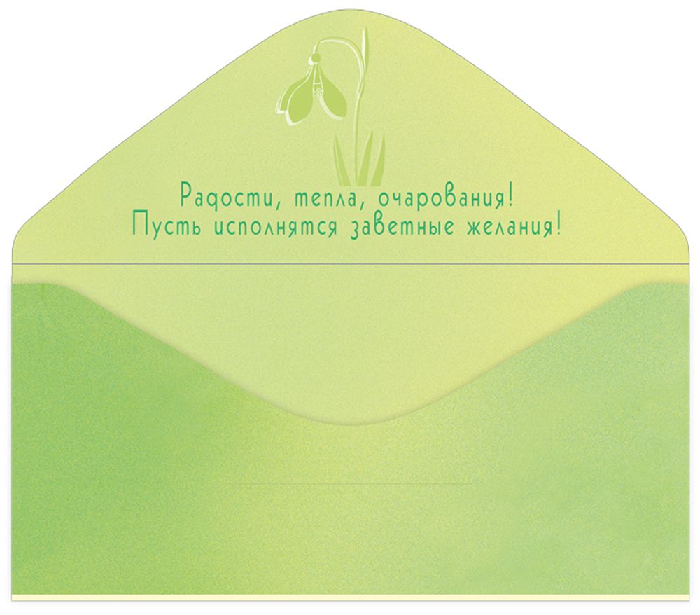 Конверт для денег формата «Евро» предназначен для оформления денежных подарков к 8 Марта и ориентирован на использование в розничной продаже и оптовых поставках для магазинов подарочной и канцелярской продукции. Изделие выполнено из плотного картона, что обеспечивает стабильную геометрию при хранении и транспортировке, а также аккуратный внешний вид при выкладке в торговом зале. Готовый размер конверта 168 × 84 мм позволяет удобно размещать в нем стандартные денежные купюры без сгибов и деформации, что важно как для конечного пользователя, так и при формировании ассортимента. На лицевой стороне размещено цветное изображение подснежников на фоне весенней зелени с декоративными золотистыми элементами и надписью «8 Марта», за счет чего конверт может использоваться как самостоятельный носитель поздравления без дополнительной открытки. Поверхность оформлена глянцевым УФ-лаком и золотой фольгой, что придает изображению выраженный контраст, устойчивость к истиранию и выцветанию, облегчает поддержание презентабельного вида при многократных перекладках и контакте с руками. Внутри предусмотрен печатный поздравительный текст, позволяющий сократить время обслуживания покупателей и упростить выбор готового решения для подарка. Конверт поставляется по 10 штук, удобен для формирования модульных выкладок и фасовки по сериям праздничной продукции. Плотный картон и стойкое лакофольговое покрытие уменьшают риск заломов и потертостей при транспортировке крупными партиями, что снижает процент брака и потерь у оптового покупателя. Изделие подходит для использования в цветочных салонах, сувенирных и книжных магазинах, на кассовых зонах супермаркетов и в корпоративных закупках для оформления денежных подарков сотрудникам к Международному женскому дню.