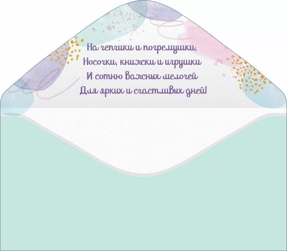 Рождение ребенка — это счастливое событие в жизни каждой семьи. Поздравить родителей с появлением малыша поможет очаровательный конверт для денег. Такая упаковка сделает простой денежный презент особенным. Милая иллюстрация украшена сияющей фольгой. Отделка подчеркивает красоту оформления и дарит праздничное настроение. Оригинальный дизайн дополнен поздравительным текстом.