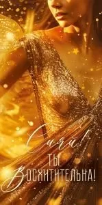 Подарочный конверт изготовлен из плотного картона. Материал хорошо держит форму и не помнется при транспортировке. Сверху на картонной основе отпечатано красочное полноцветное изображение, покрытое блестками. На обратной стороне есть теплые пожелания.