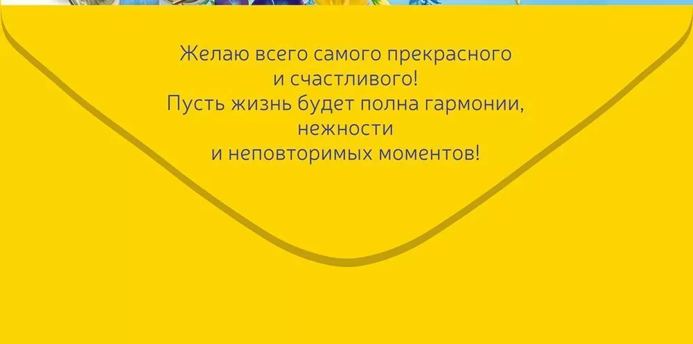 Подарочный конверт изготовлен из плотного картона. Материал хорошо держит форму и не помнется при транспортировке. Сверху на картонной основе отпечатано красочное полноцветное изображение, покрытое блестками. На обратной стороне есть теплые пожелания.