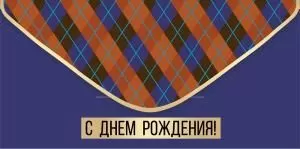 Конверт для денег понравится тем, кто ценит сдержанную элегантность. Основной фон глубокого синего цвета создает впечатление солидности, а верхняя часть оформлена в традиционную клетку «аргайл» в теплых коричневых и оранжевых оттенках с тонкими голубыми линиями. Этот узор ассоциируется с классикой британского стиля, подчеркивает утонченность и безупречный вкус. В нижней части размещена надпись «С Днем рождения!», выполненная строгим шрифтом на золотистом фоне, что добавляет дизайну торжественности.