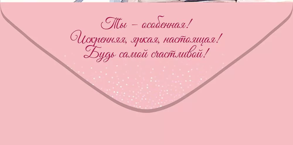 Подарочный конверт изготовлен из плотного картона. Материал хорошо держит форму и не помнется при транспортировке. Сверху на картонной основе отпечатано красочное полноцветное изображение. На обратной стороне есть теплые пожелания.